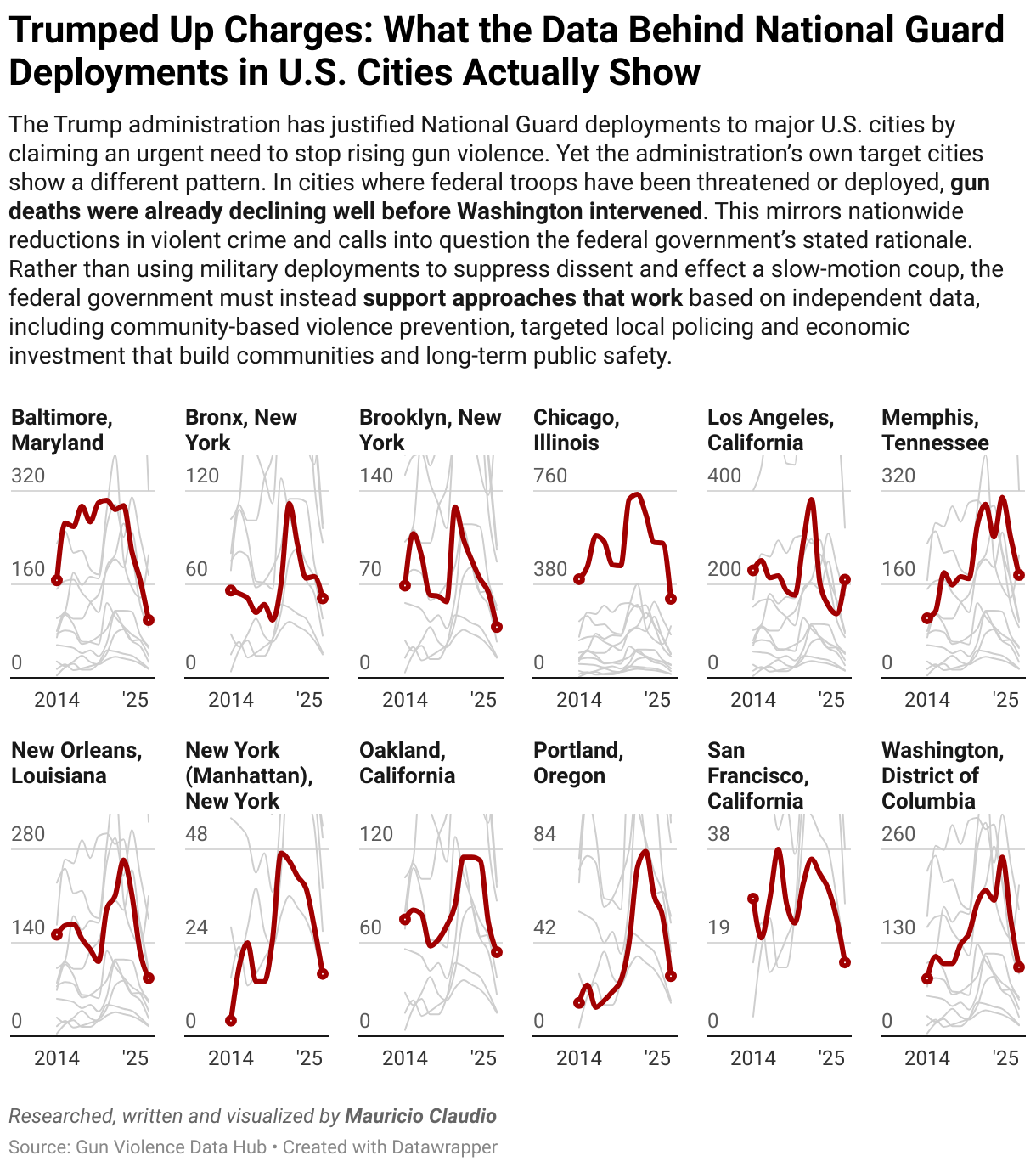 The Trump administration has justified National Guard deployments to major U.S. cities by claiming an urgent need to stop rising gun violence. Yet the administration’s own target cities show a different pattern. In cities where federal troops have been threatened or deployed, gun deaths were already declining well before Washington intervened. This mirrors nationwide reductions in violent crime and calls into question the federal government’s stated rationale. Rather than using military deployments to suppress dissent and effect a slow-motion coup, the federal government must instead support approaches that work based on independent data, including community-based violence prevention, targeted local policing and economic investment that build communities and long-term public safety.