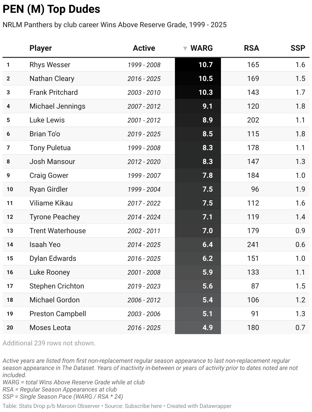 NRLM Panthers by club career Wins Above Reserve Grade, 1999 - 2025