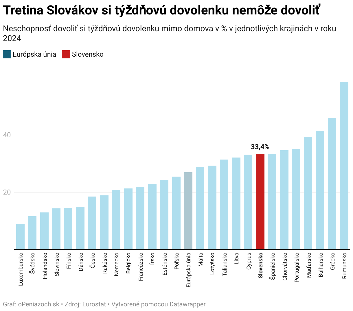 Neschopnosť dovoliť si týždňovú dovolenku mimo domova v % v jednotlivých krajinách v roku 2024