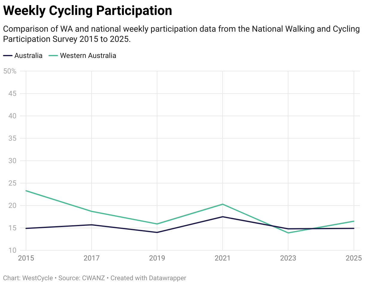 Comparison of WA and national weekly participation data from the National Walking and Cycling Participation Survey 2015 to 2025.