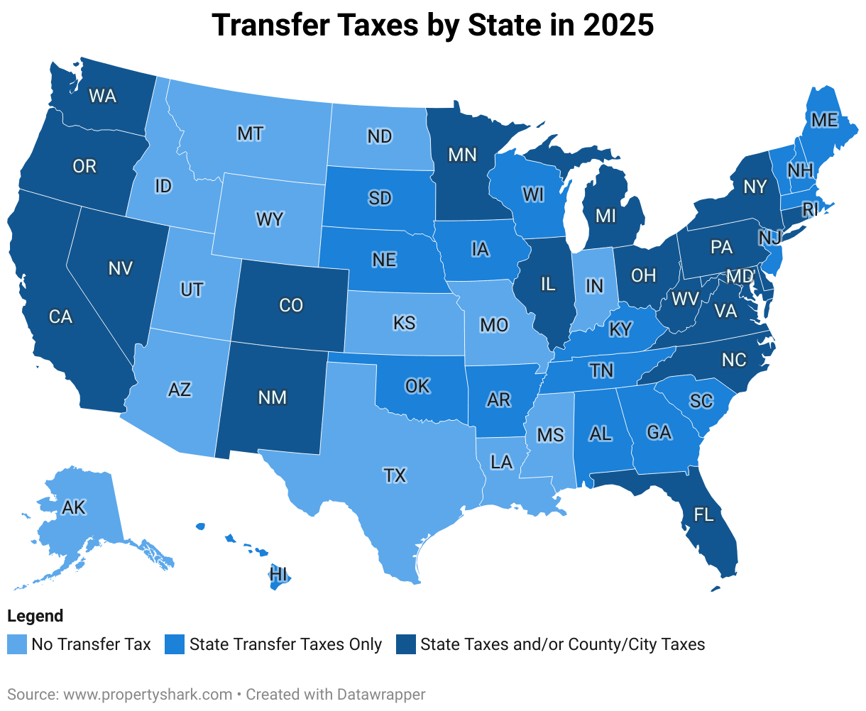 Map of the United States, showing what states have state transfer taxes only, states taxes and/or county/city taxes or no transfer taxes.