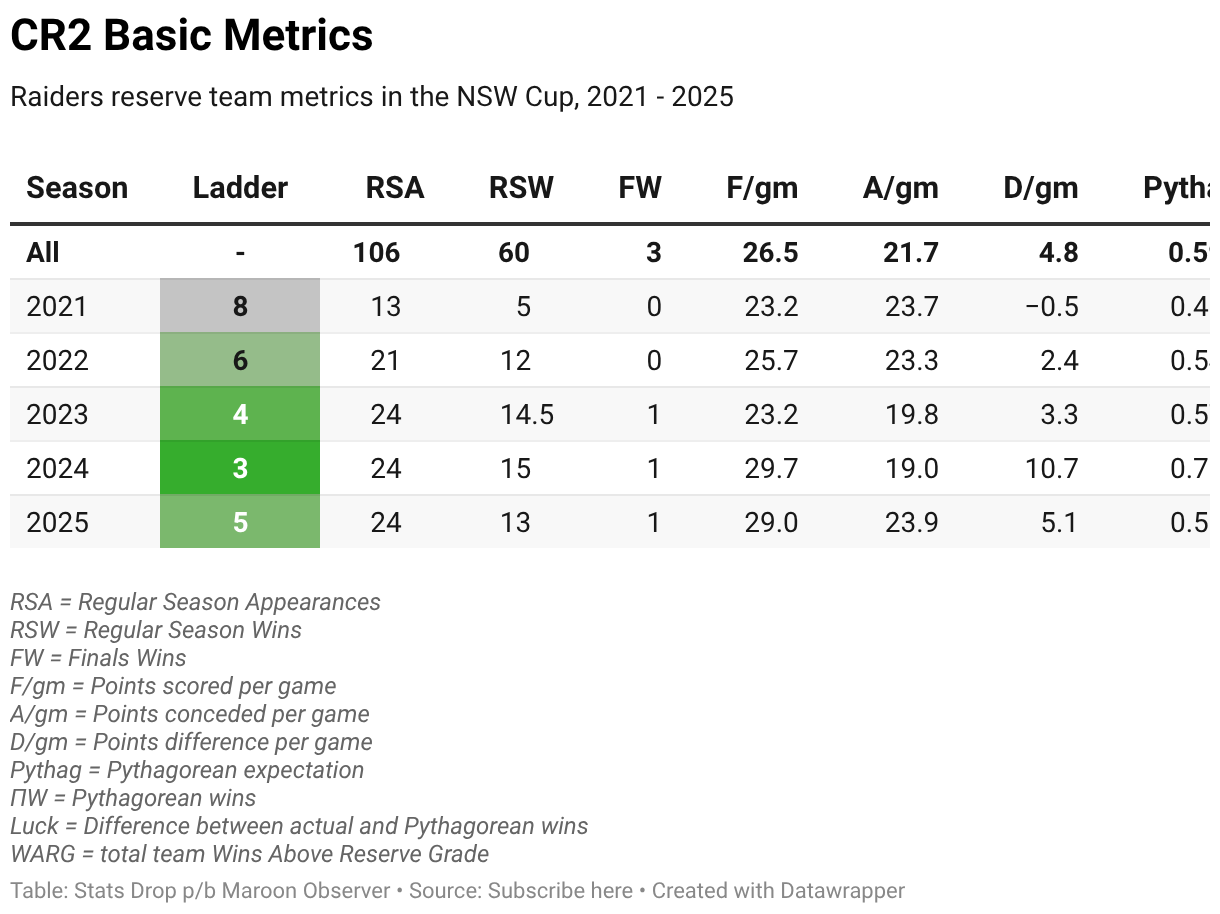 Raiders reserve team metrics in the NSW Cup, 2021 - 2025