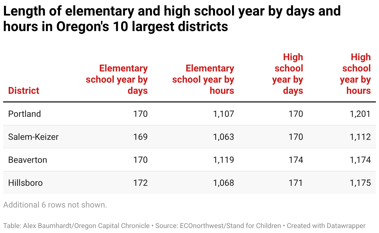 Length of elementary and high school year by days and hours in Oregon's 10 largest districts