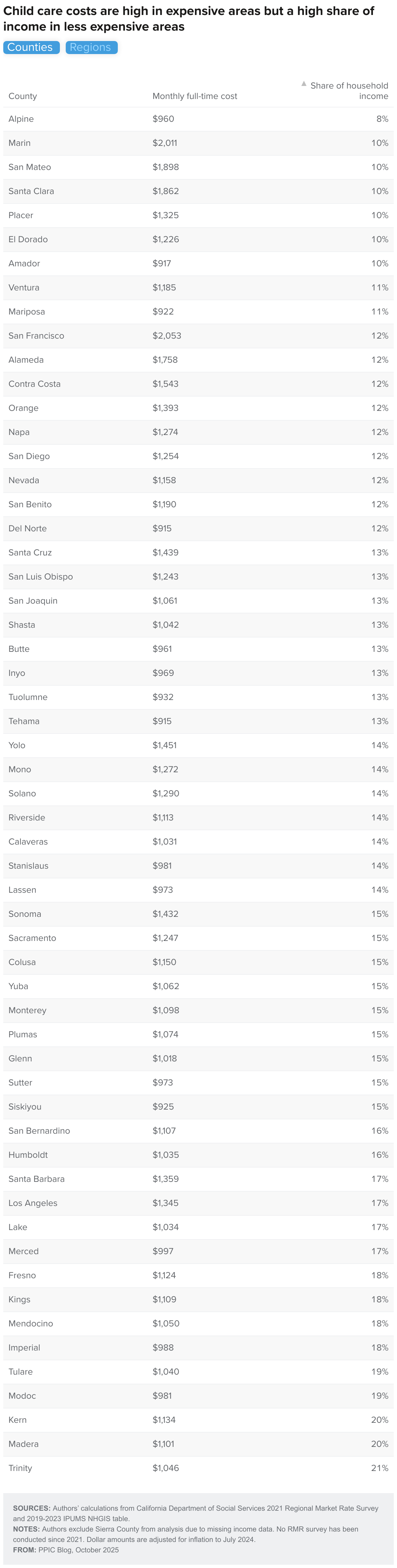 Child care costs are high in expensive areas but a high share of income in less expensive areas