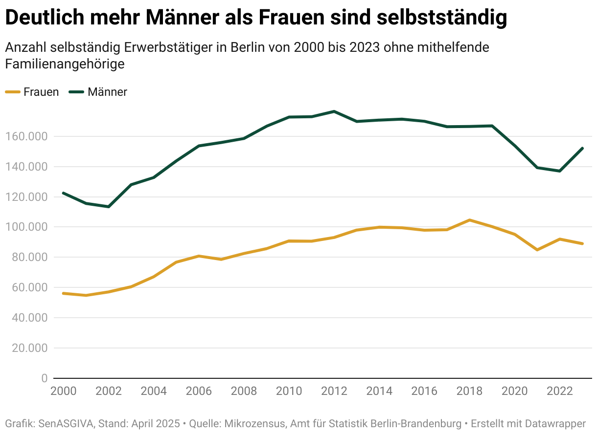 Im Jahr 2023 gingen etwa 152.000 Berliner Männer einer selbstständigen Beschäftigung nach. Bei den Berlinerinnen waren es mit etwa 89.000 deutlich weniger.