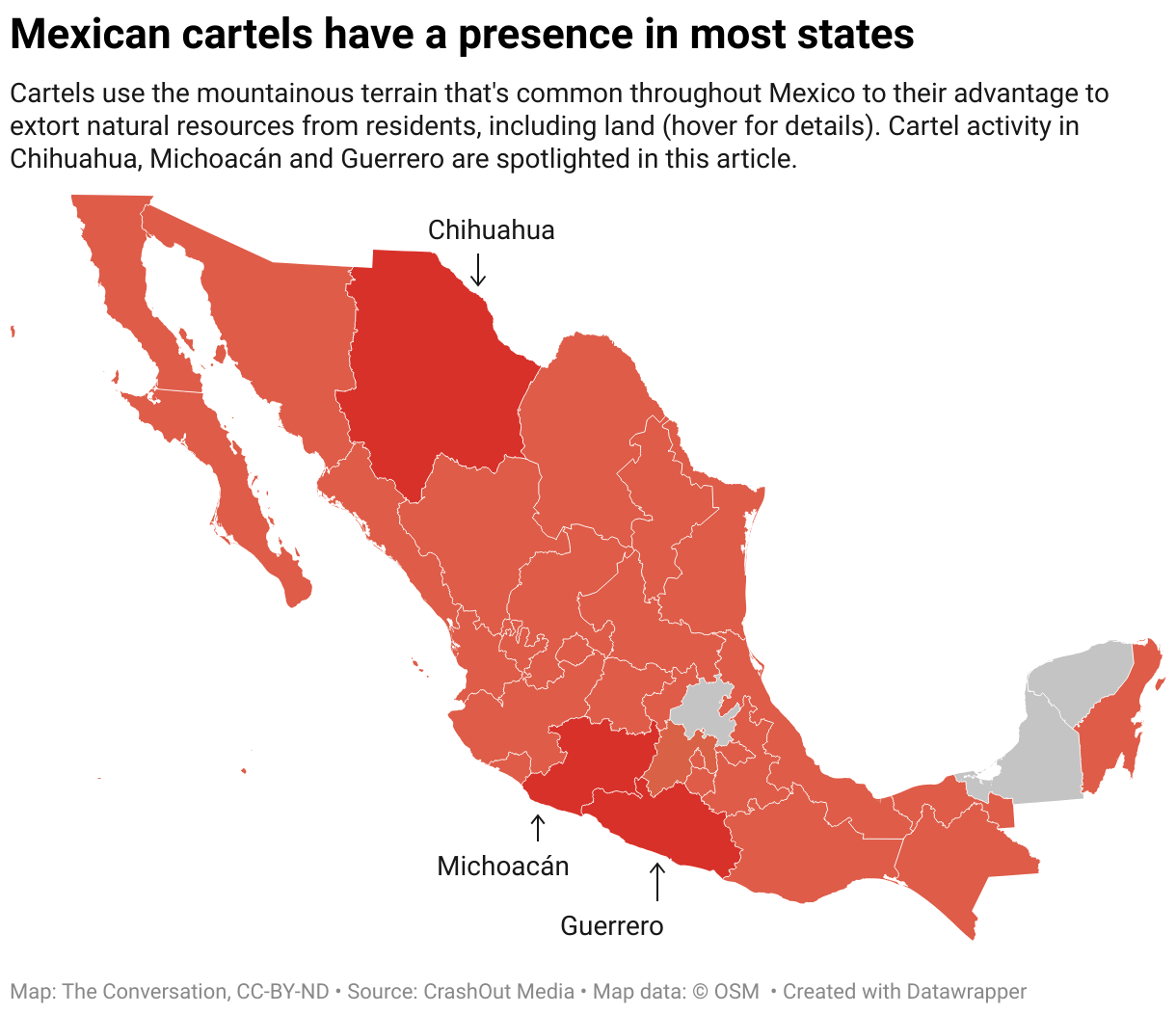 Cartels use the mountainous terrain that's common throughout Mexico to their advantage to extort natural resources from residents, including land (hover for details). Cartel activity in Chihuahua, Michoacán and Guerrero are spotlighted in this article.