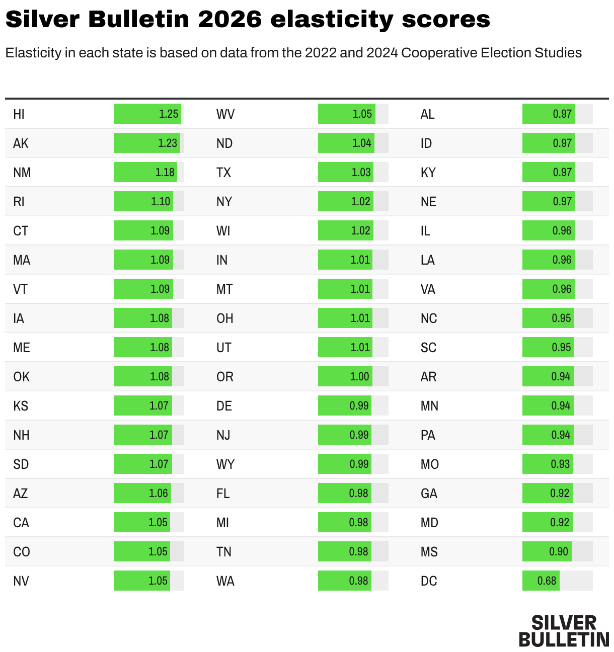 Elasticity in each state is based on data from the 2022 and 2024 Cooperative Election Studies