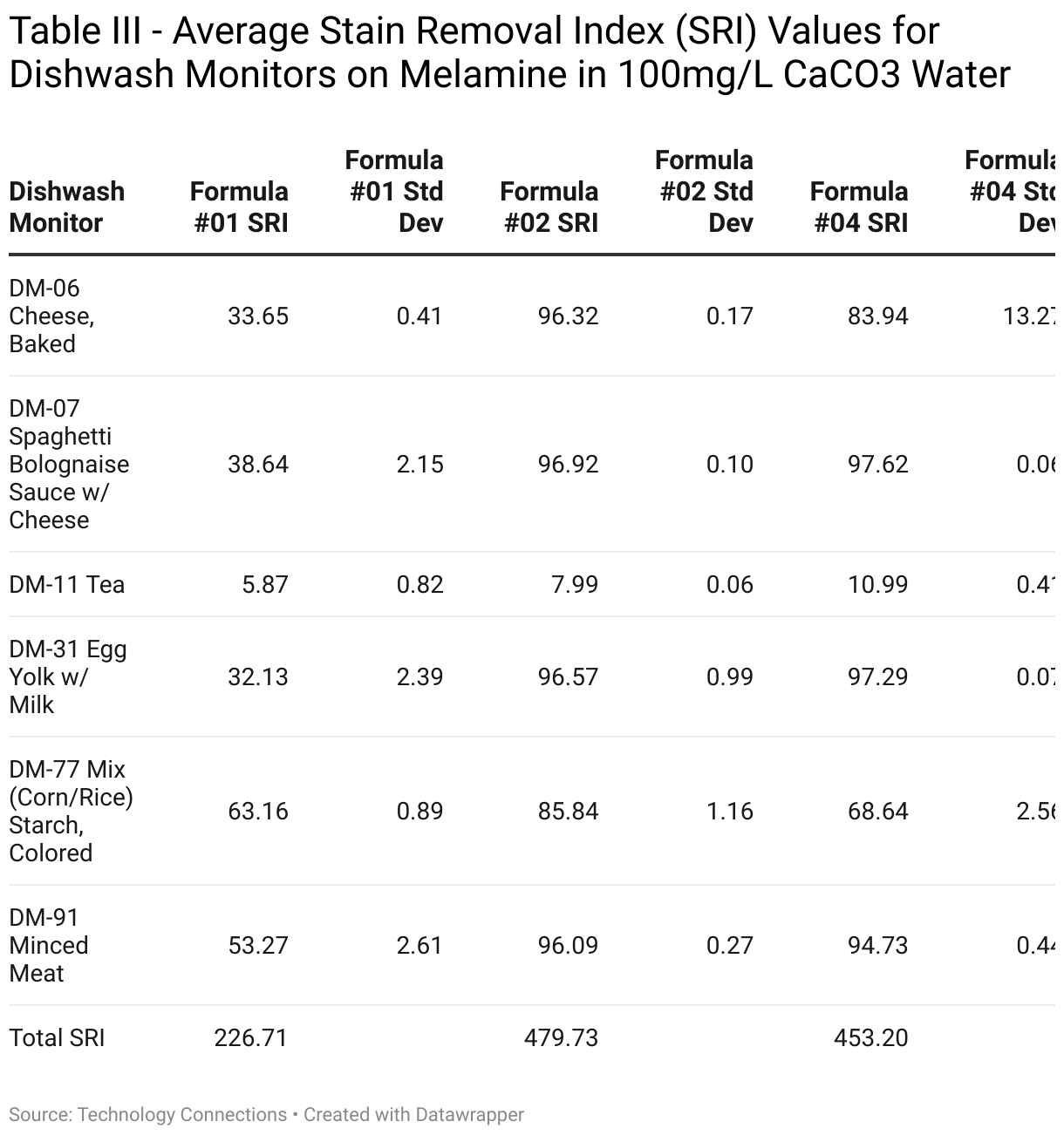Table III - Average Stain Removal Index (SRI) Values for Dishwash Monitors on Melamine in 100mg/L CaCO3 Water