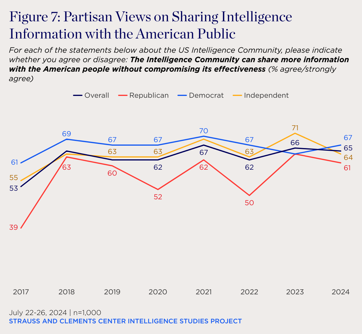 For each of the statements below about the US Intelligence Community, please indicate whether you agree or disagree: The Intelligence Community can share more information with the American people without compromising its effectiveness (% agree/strongly agree)