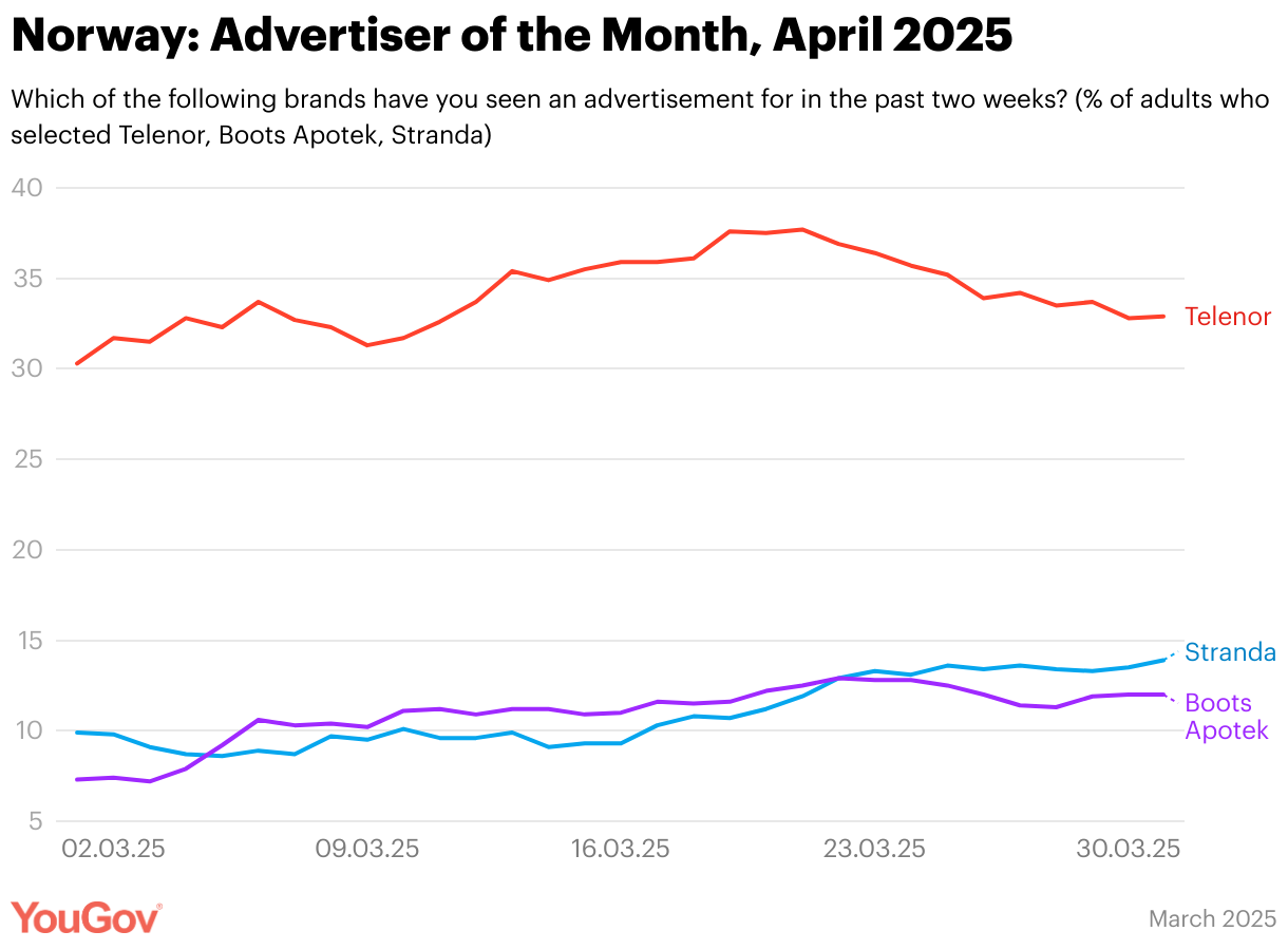 Which of the following brands have you seen an advertisement for in the past two weeks? (% of adults who selected Telenor, Boots Apotek, Stranda)