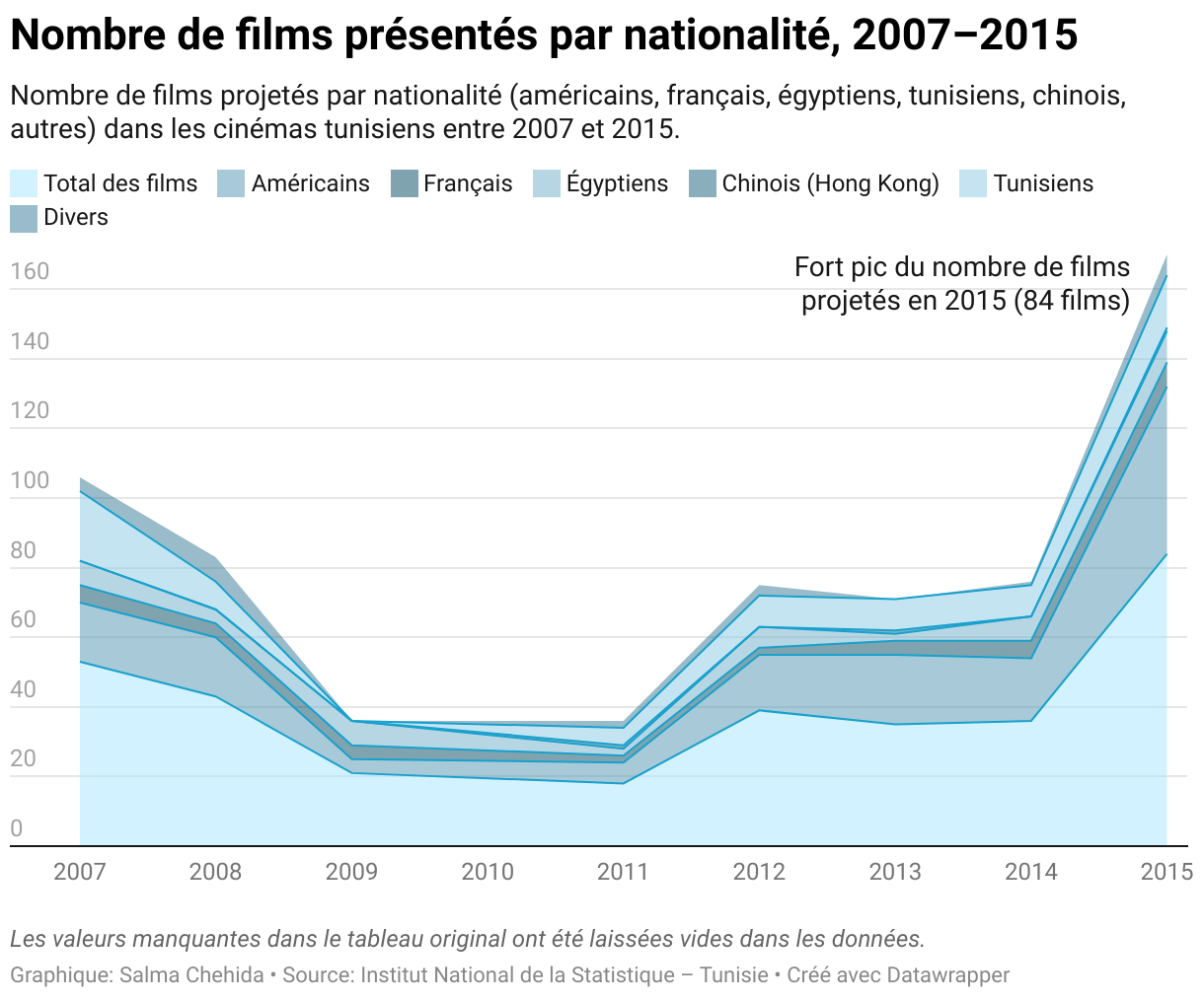 Nombre de films projetés par nationalité (américains, français, égyptiens, tunisiens, chinois, autres) dans les cinémas tunisiens entre 2007 et 2015.