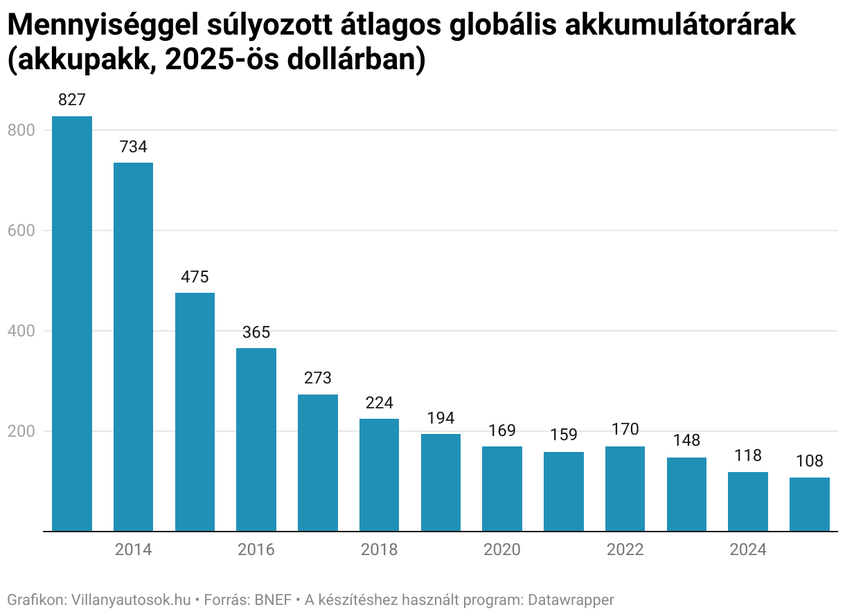 Mennyiséggel súlyozott átlagos globális akkumulátorárak (akkupakk, 2025-ös dollárban)