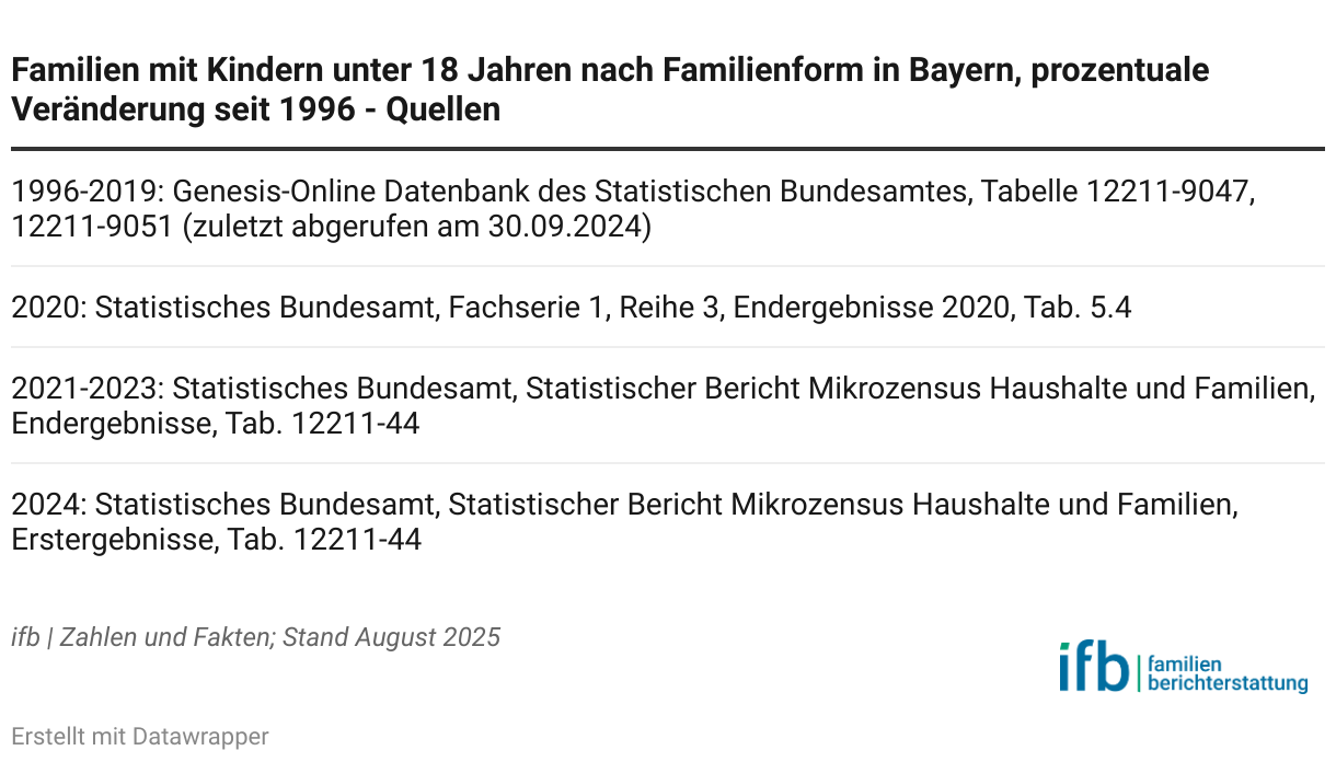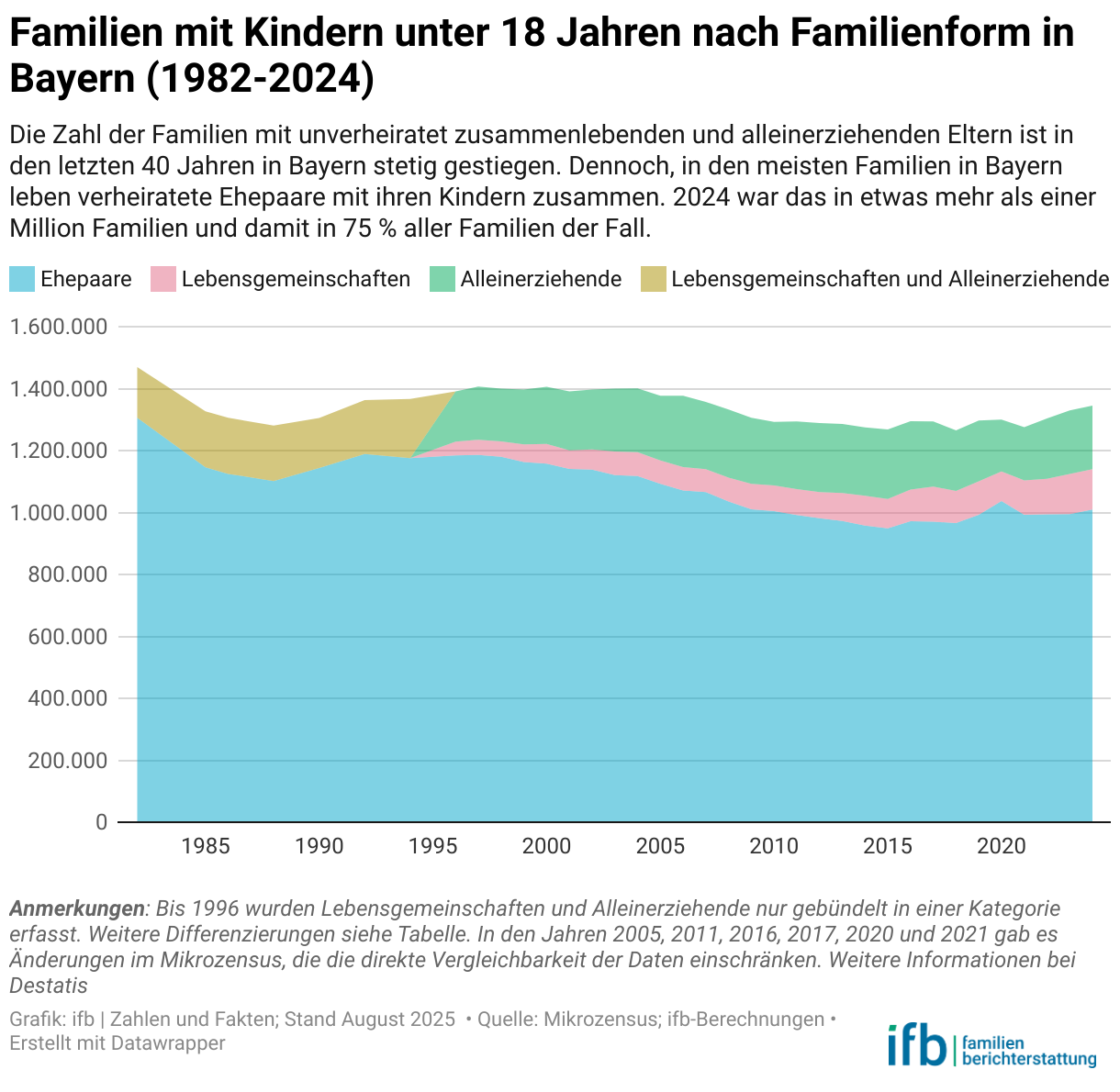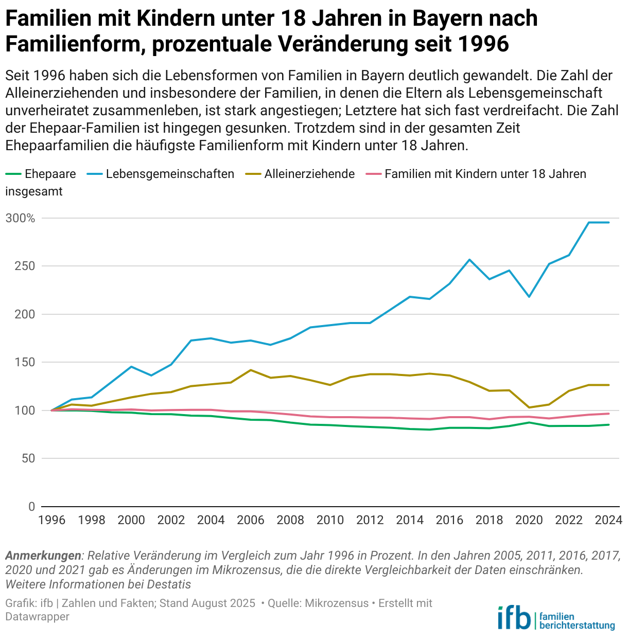 Seit 1996 haben sich die Lebensformen von Familien in Bayern deutlich gewandelt. Die Zahl der Alleinerziehenden und insbesondere der Familien, in denen die Eltern als Lebensgemeinschaft unverheiratet zusammenleben, ist stark angestiegen; Letztere hat sich fast verdreifacht. Die Zahl der Ehepaar-Familien ist hingegen gesunken. Trotzdem sind in der gesamten Zeit Ehepaarfamilien die häufigste Familienform mit Kindern unter 18 Jahren.