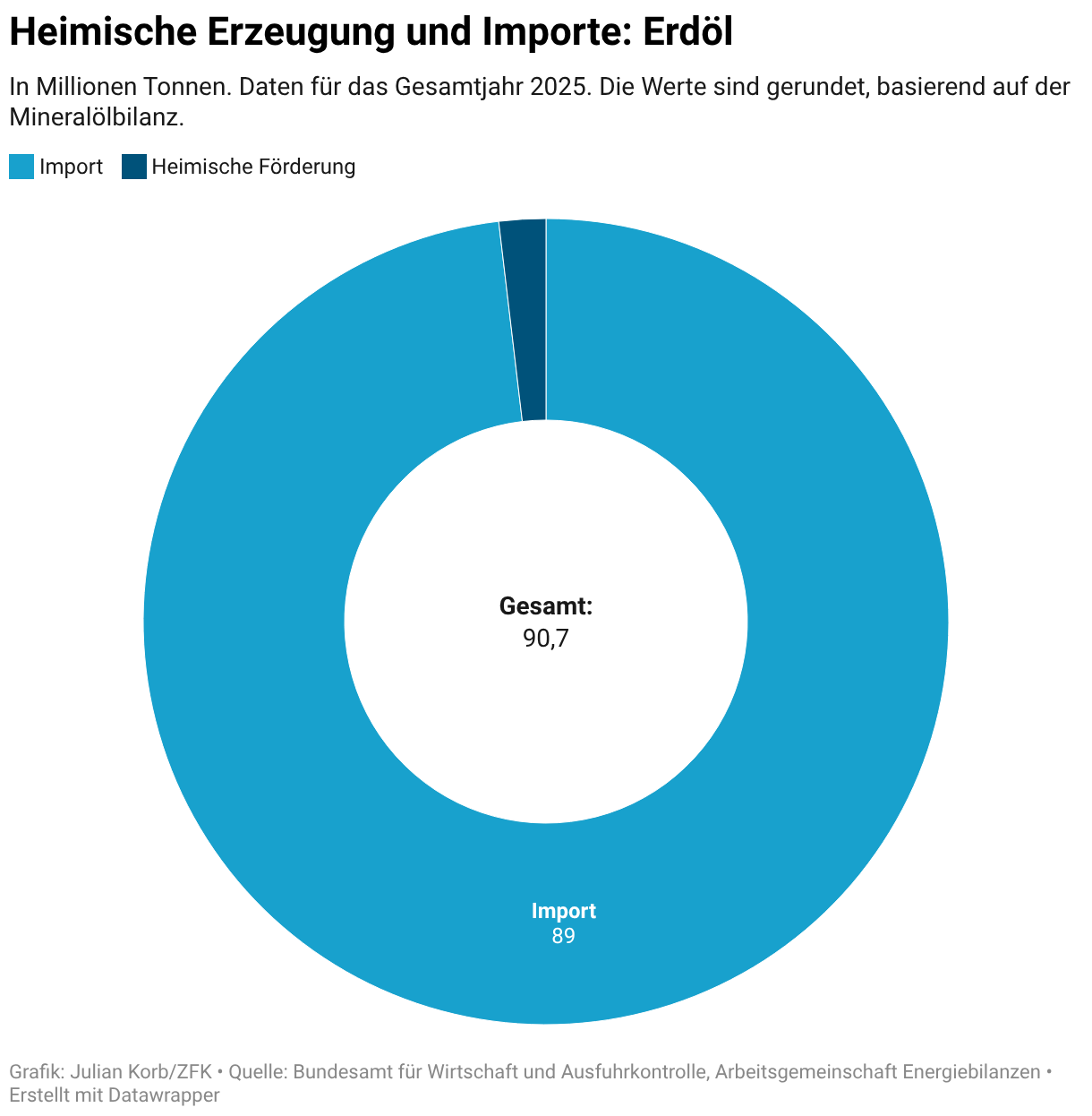 In Millionen Tonnen. Daten für das Gesamtjahr 2025. Die Werte sind gerundet, basierend auf der Mineralölbilanz.