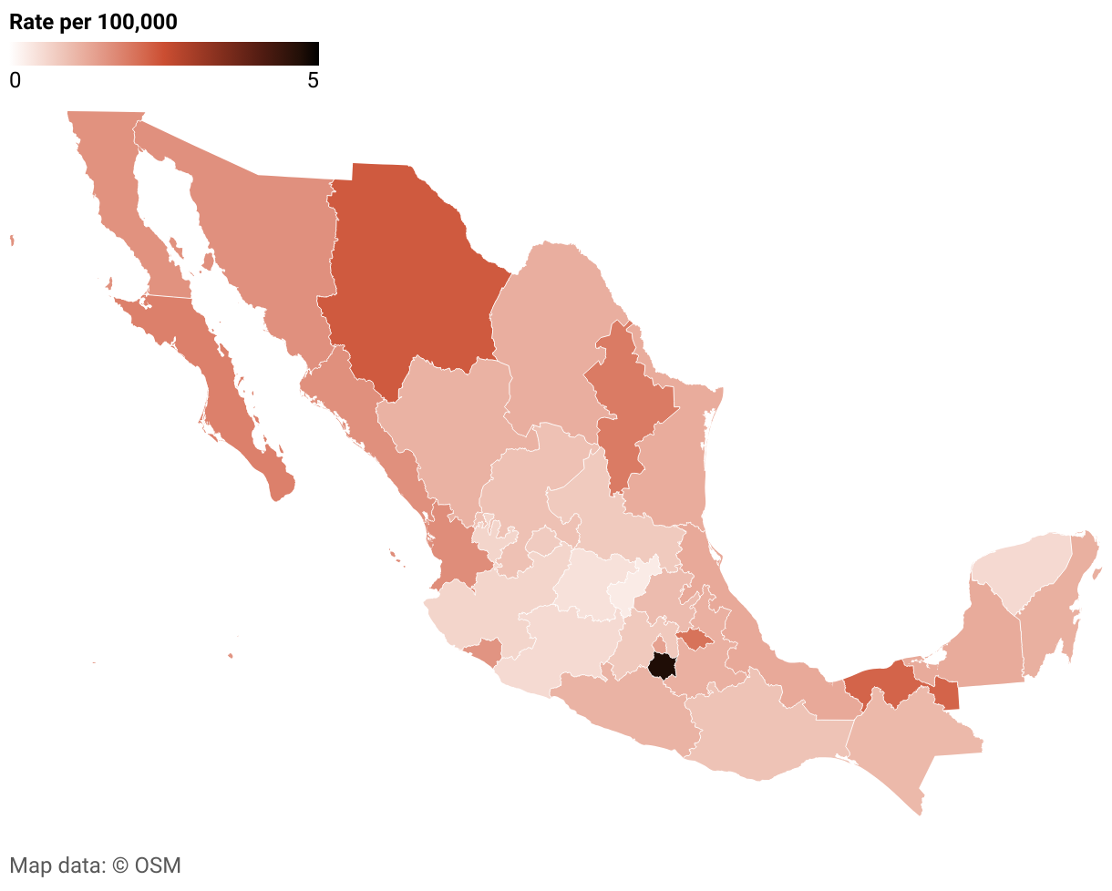 In Mexico, the rate of femicide is 1.18 per every 100,000 in 2024. Morelos has the highest femicide rate across Mexico, with 4.7 women killed per 100,000.