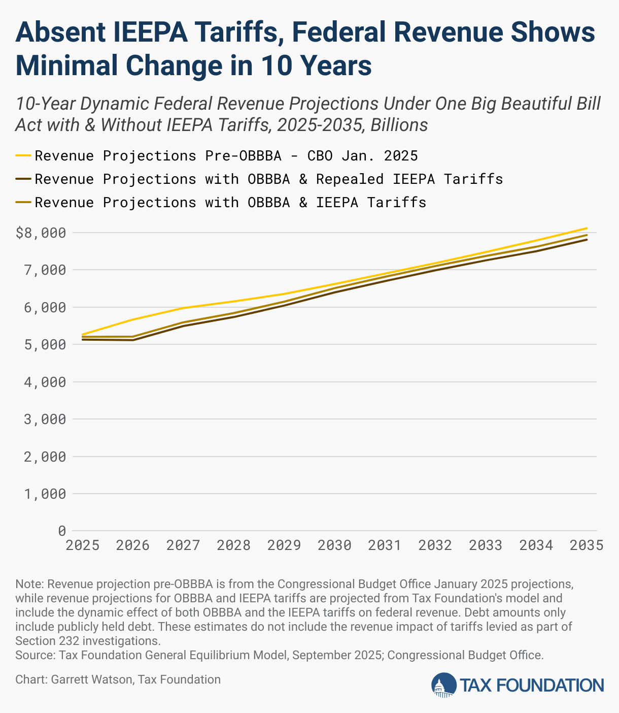 10-Year Dynamic Federal Revenue Projections Under One Big Beautiful Bill Act with & Without IEEPA Tariffs, 2025-2035, Billions