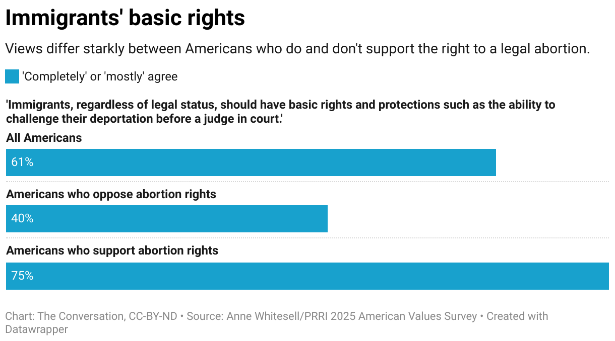 Two sets of bar charts show the percentage of Americans who support basic immigration rights overall. Among respondents who support the right to abortion, fewer support basic rights for immigrants. The percentages are higher among Americans who do support the right to abortion.