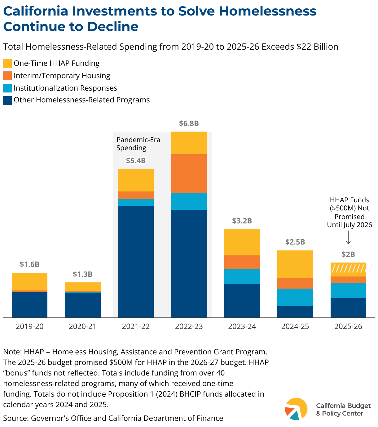 Bar chart showing total homelessness-related spending from 2019-20 to 2025-26 which is approximately $22.7B. The total spending categories are broken into four different categories: one-time HHAP, Interim/Temporary housing, institutionalization responses, and other homelessness-related programs.