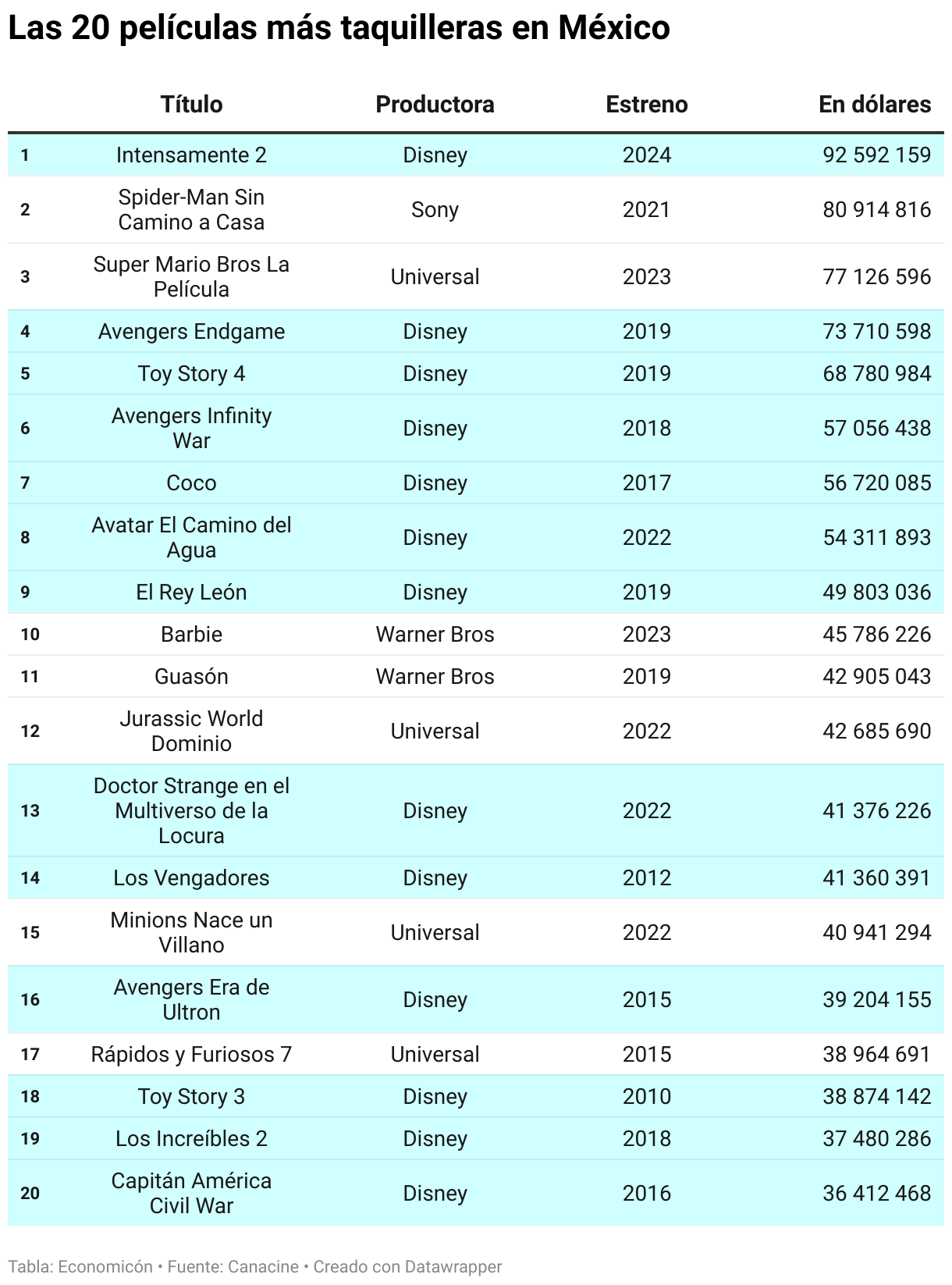 Listado de las 20 películas más taquilleras en México, con Intensamente 2 en primer lugar. Le siguen: Spider-Man Sin Camino a Casa (2021), Super Mario Bros La Película (2023) y Avengers Endgame (2019). Fuente: Canacine