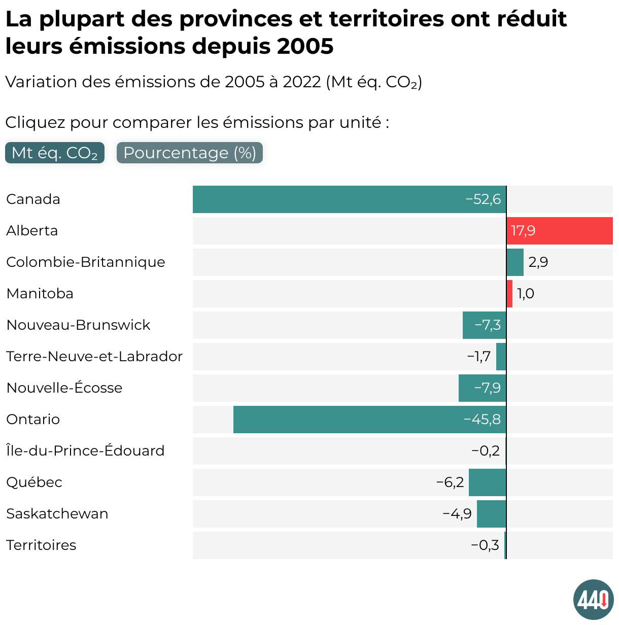 Variation des émissions de 2005 à 2022 (Mt éq. CO₂) Cliquez pour comparer les émissions par unité : Mt éq. CO₂ Pourcentage (%)