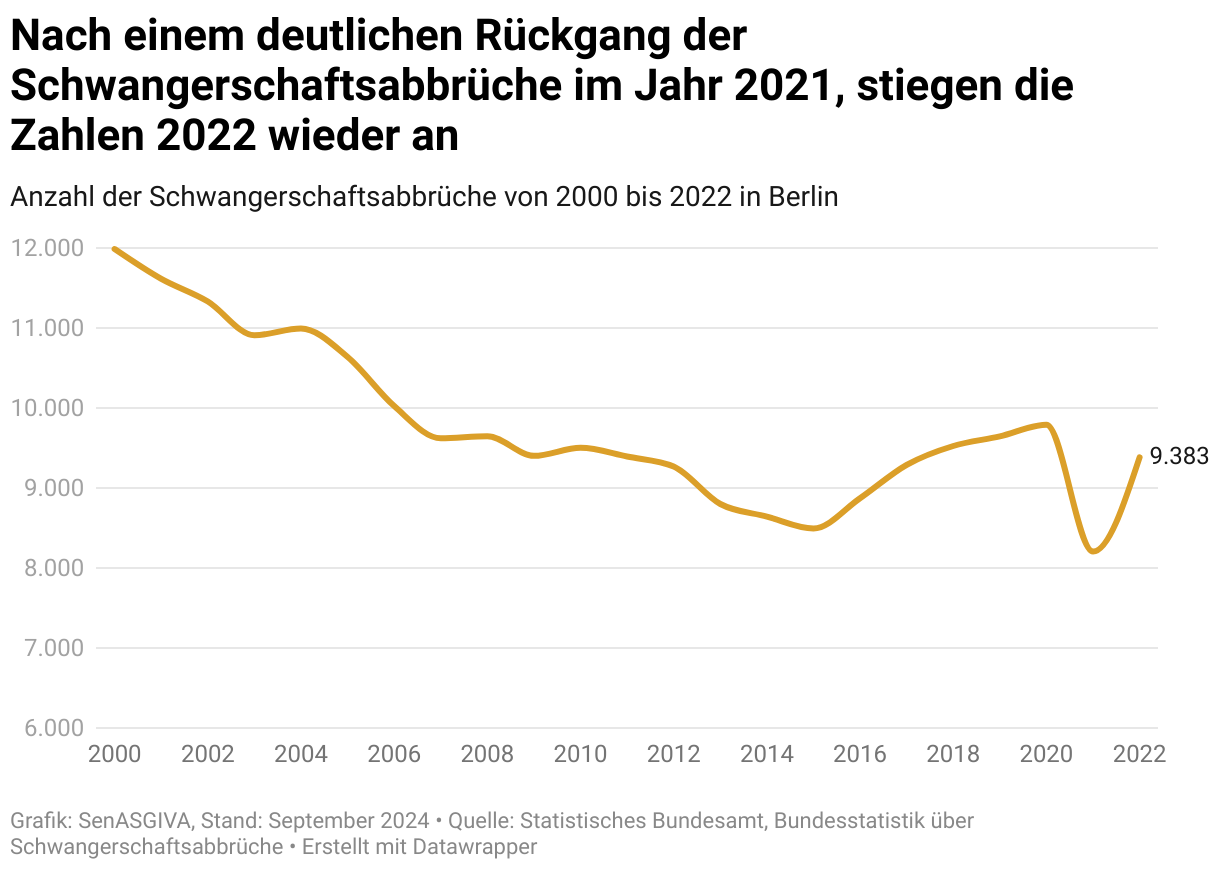 Von 2000 bis 2015 sank die Zahl der Schwangerschaftsabbrüche in Berlin. Von 2015 bis 2020 stiegen die Zahlen wieder an. Für das Jahr 2021 zeigt sich eine deutlicher Rückgang der Zahlen im Vergleich zu 2020 und 2022.