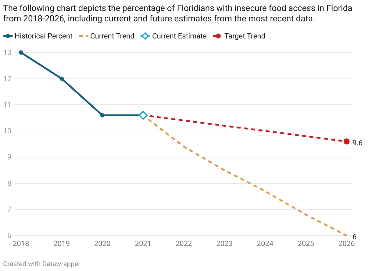 The following chart depicts the percentage of Floridians with insecure food access in Florida from 2018-2026, including current and future estimates from the most recent data.