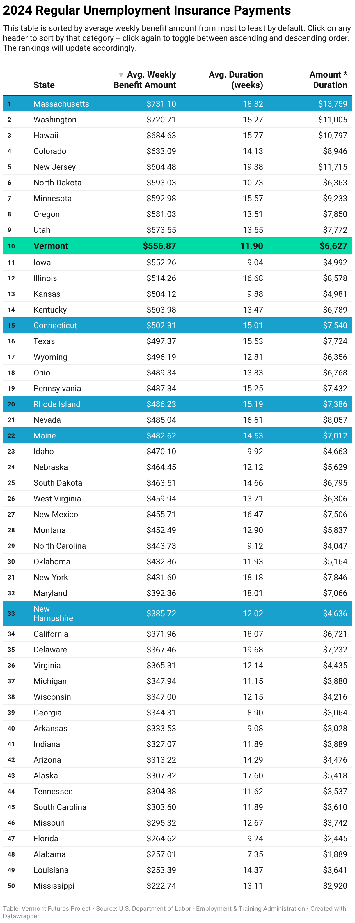 This table is sorted by average weekly benefit amount from most to least by default. Click on any header to sort by that category -- click again to toggle between ascending and descending order. The rankings will update accordingly.