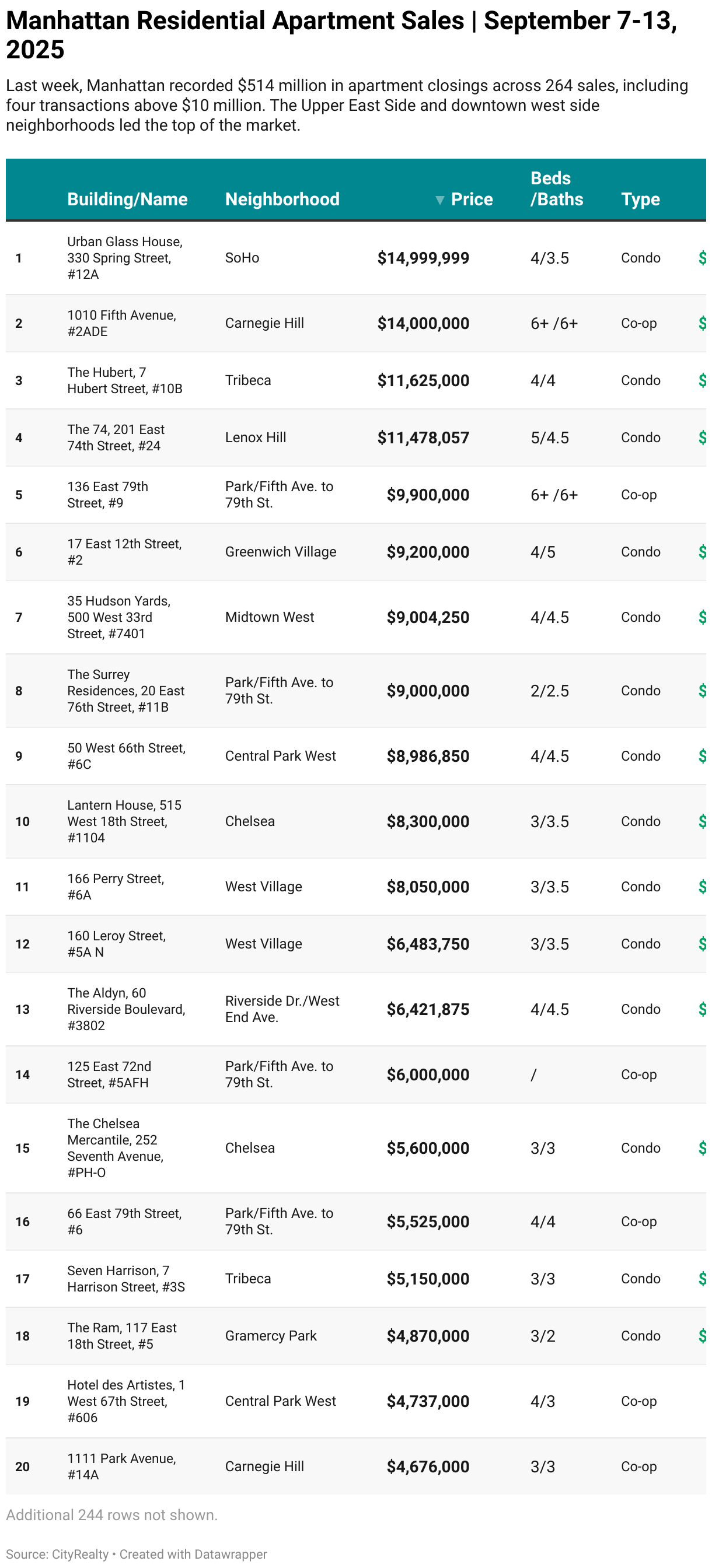 Last week, Manhattan recorded $514 million in apartment closings across 264 sales, including four transactions above $10 million. The Upper East Side and downtown west side neighborhoods led the top of the market.