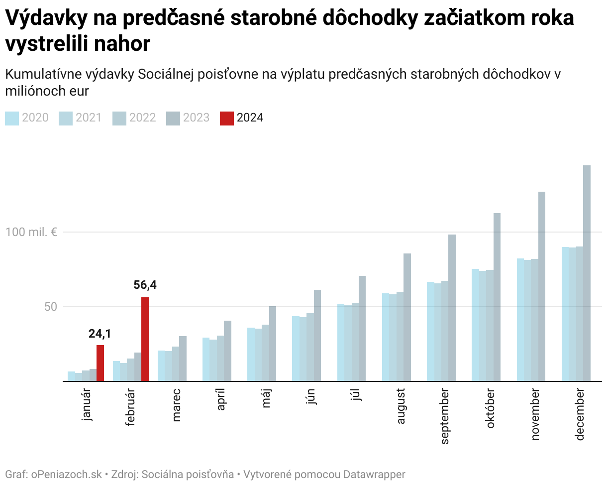 Kumulatívne výdavky Sociálnej poisťovne na výplatu predčasných starobných dôchodkov v miliónoch eur