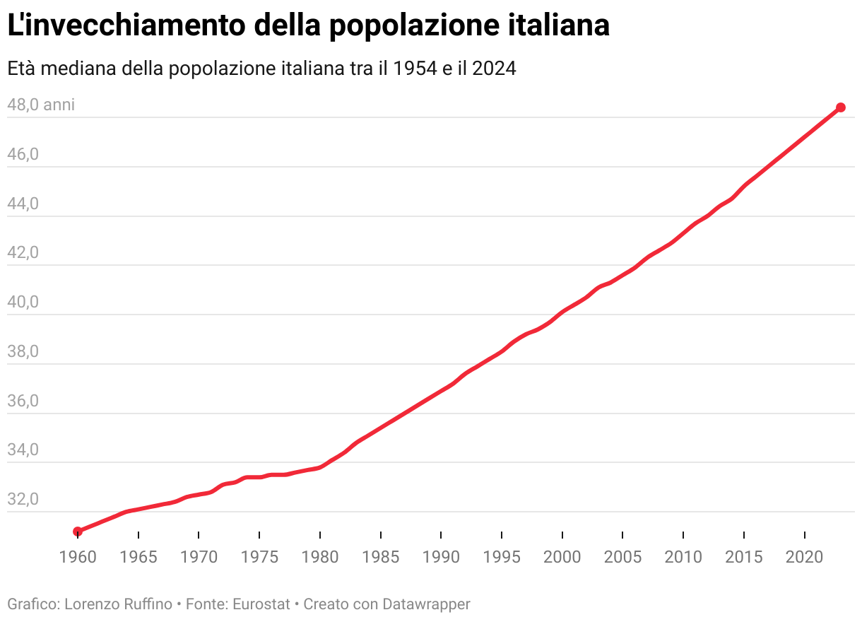 Età mediana della popolazione italiana tra il 1954 e il 2024