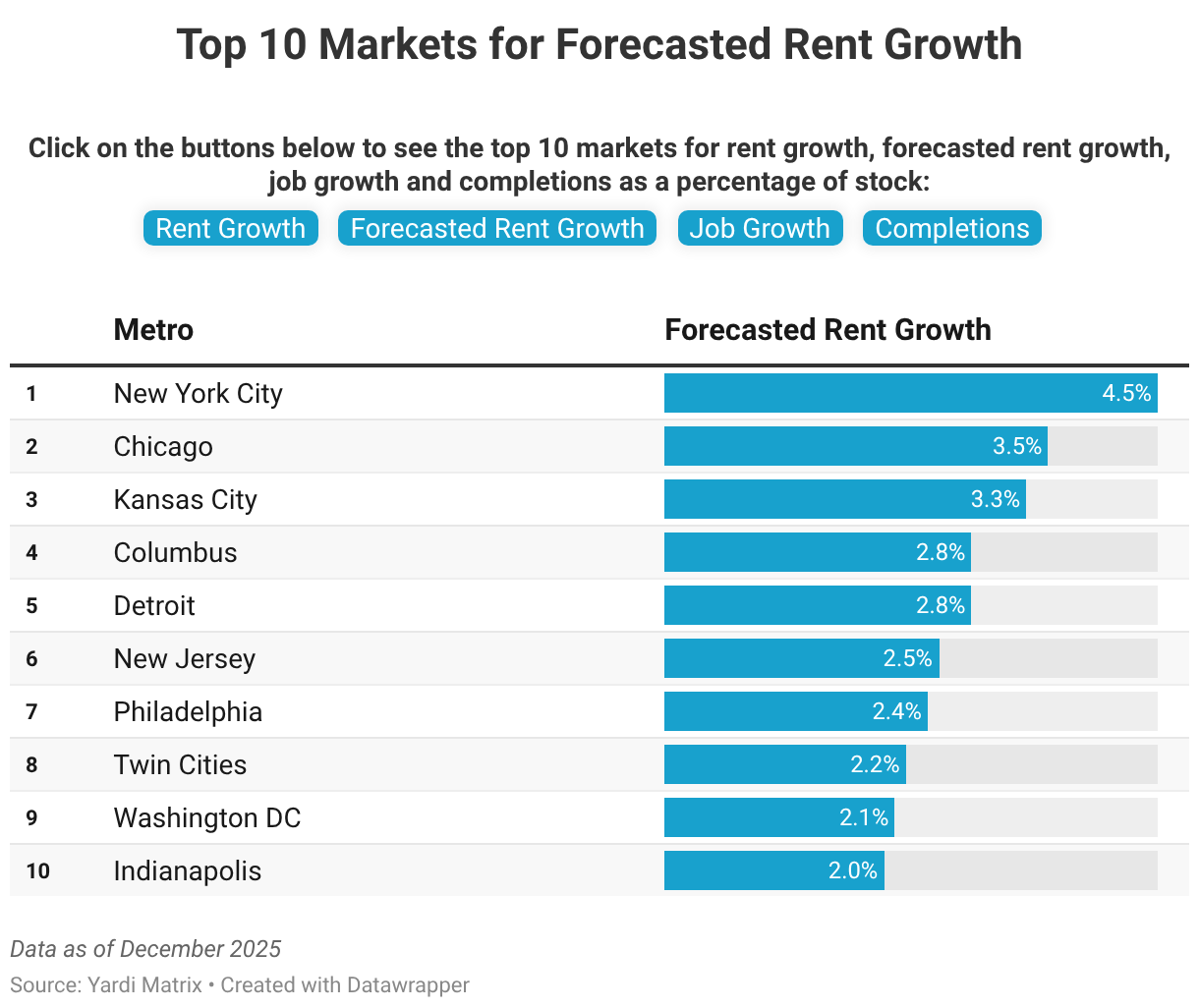 Click on the buttons below to see the top 10 markets for rent growth, forecasted rent growth, job growth and completions as a percentage of stock: