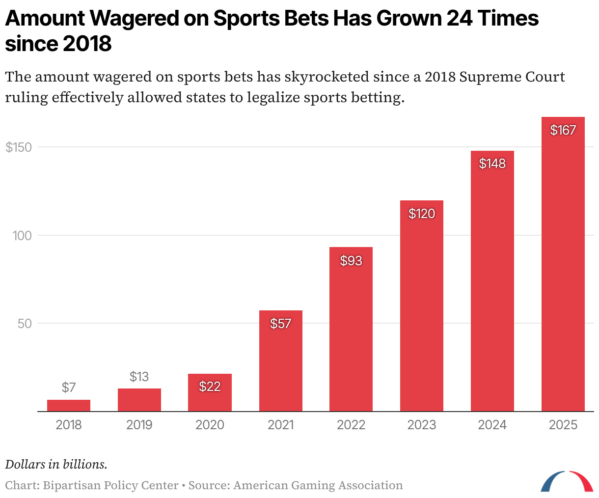 The amount wagered on sports bets has skyrocketed since a 2018 Supreme Court ruling effectively allowed states to legalize sports betting.