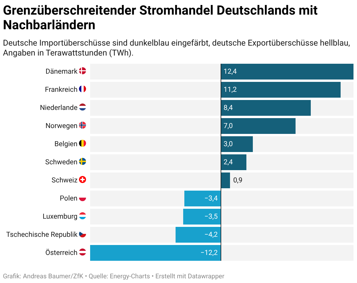 Deutsche Importüberschüsse sind dunkelblau eingefärbt, deutsche Exportüberschüsse hellblau, Angaben in Terawattstunden (TWh).