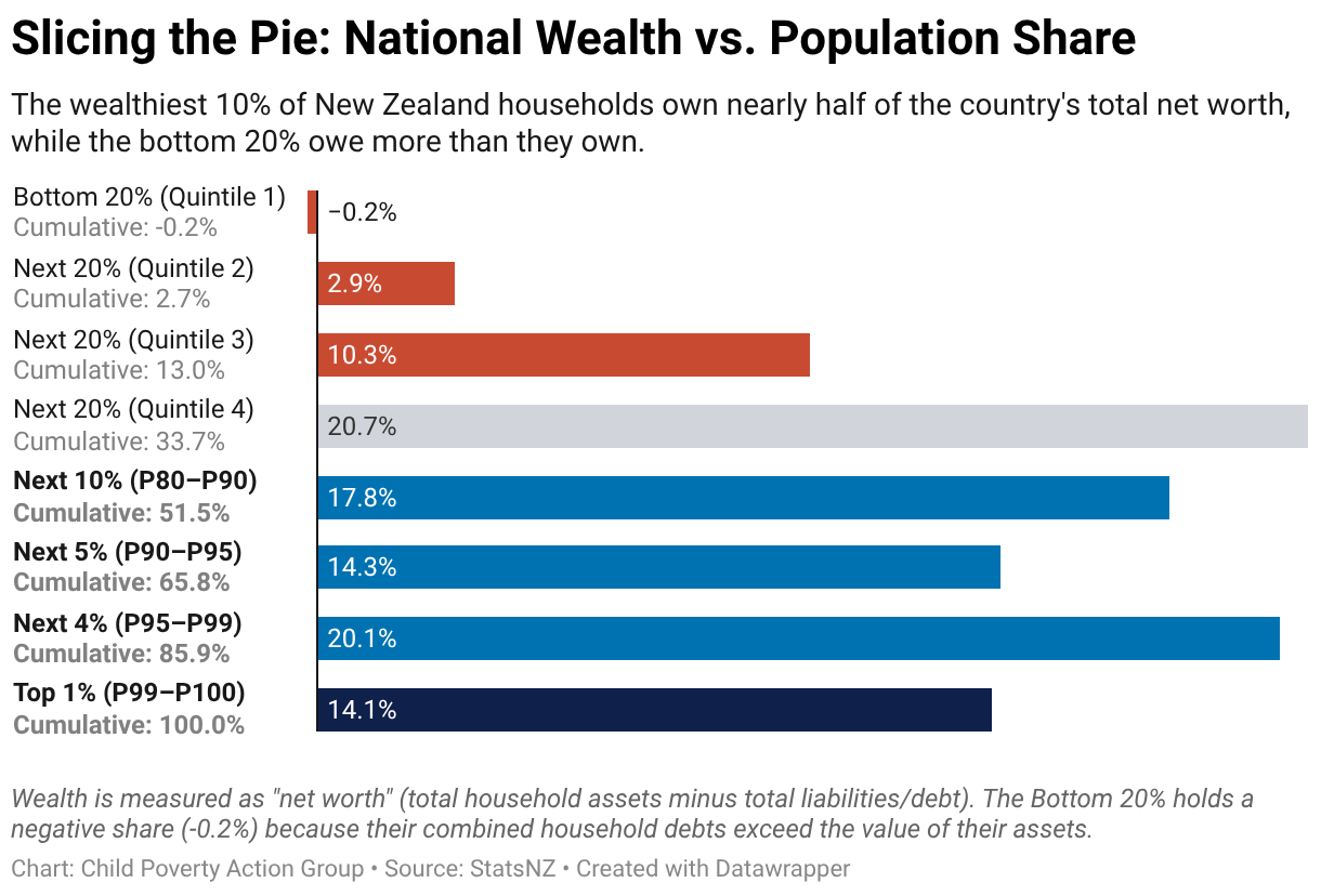 The wealthiest 10% of New Zealand households own nearly half of the country's total net worth, while the bottom 20% owe more than they own.