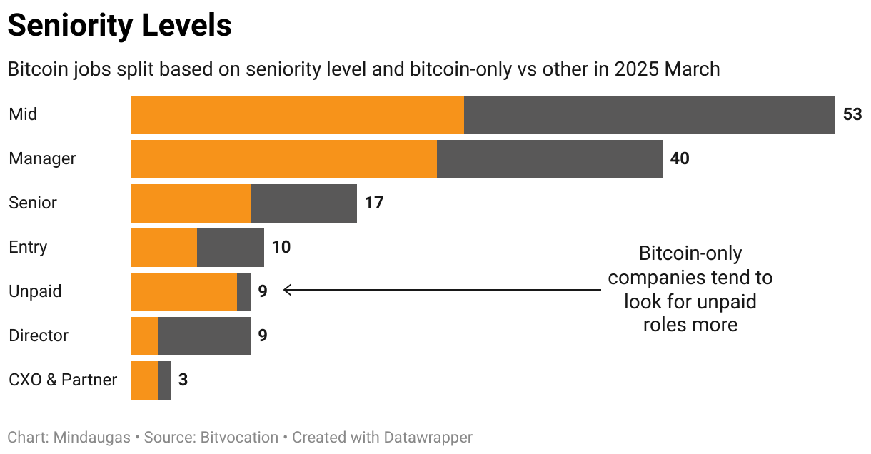 Bitcoin jobs split based on seniority level and bitcoin-only vs other in 2025 March