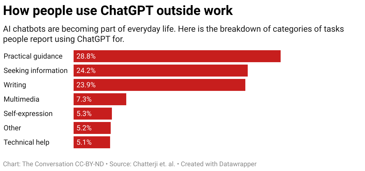 AI chatbots are becoming part of everyday life. Here is the breakdown of categories of tasks people report using ChatGPT for.