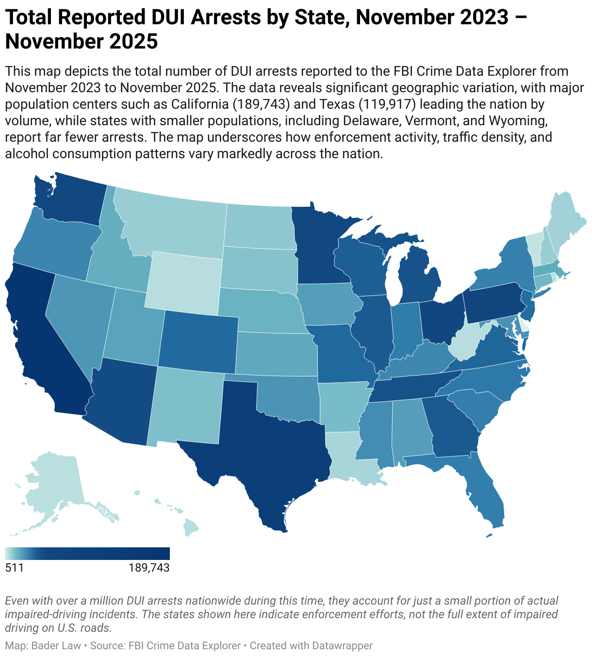 This map depicts the total number of DUI arrests reported to the FBI Crime Data Explorer from November 2023 to November 2025. The data reveals significant geographic variation, with major population centers such as California (189,743) and Texas (119,917) leading the nation by volume, while states with smaller populations, including Delaware, Vermont, and Wyoming, report far fewer arrests. The map underscores how enforcement activity, traffic density, and alcohol consumption patterns vary markedly across the nation.