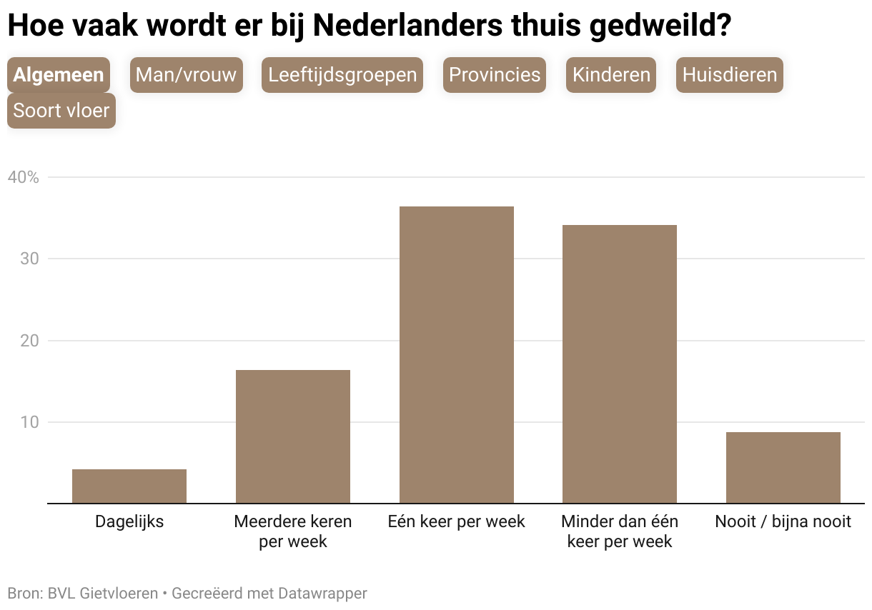 Algemeen Man/vrouw Leeftijdsgroepen Provincies Kinderen Huisdieren Soort vloer