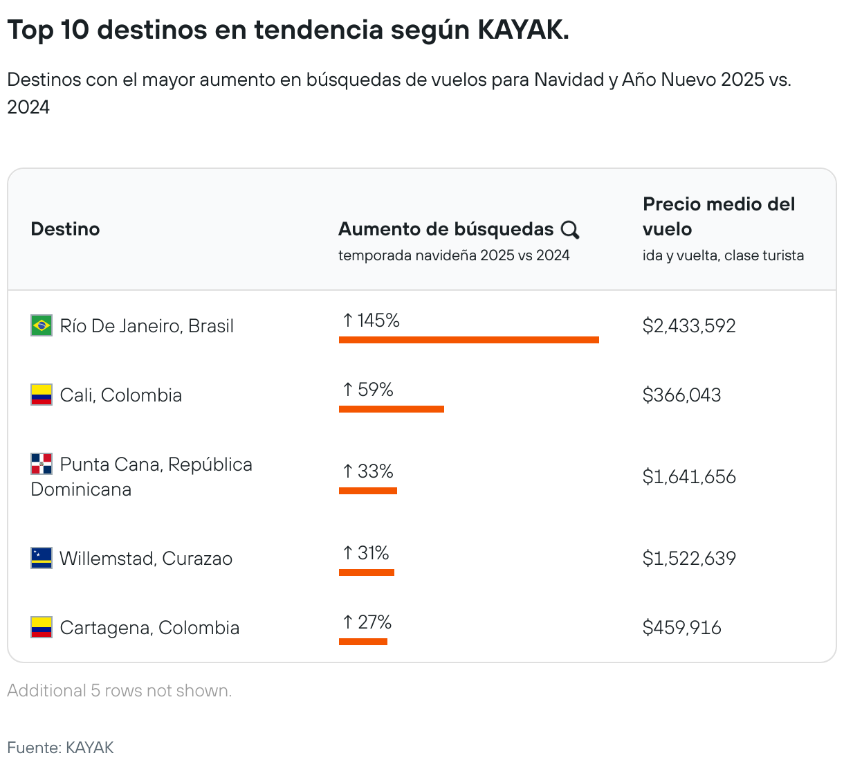 Destinos con el mayor aumento en búsquedas de vuelos para Navidad y Año Nuevo 2025 vs. 2024