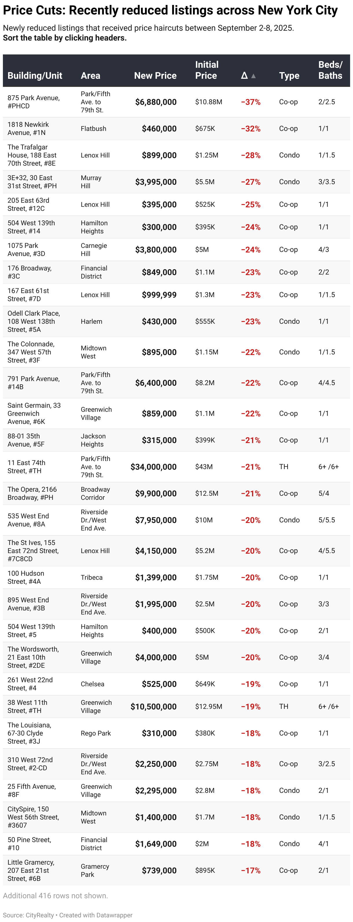 Newly reduced listings that received price haircuts between September 2-8, 2025. Sort the table by clicking headers.