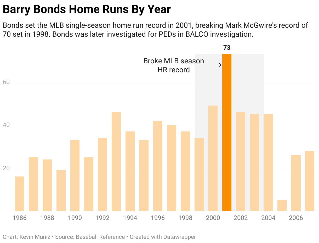 Bonds set the MLB single-season home run record in 2001, breaking Mark McGwire's record of 70 set in 1998. Bonds was later investigated for PEDs in BALCO investigation.