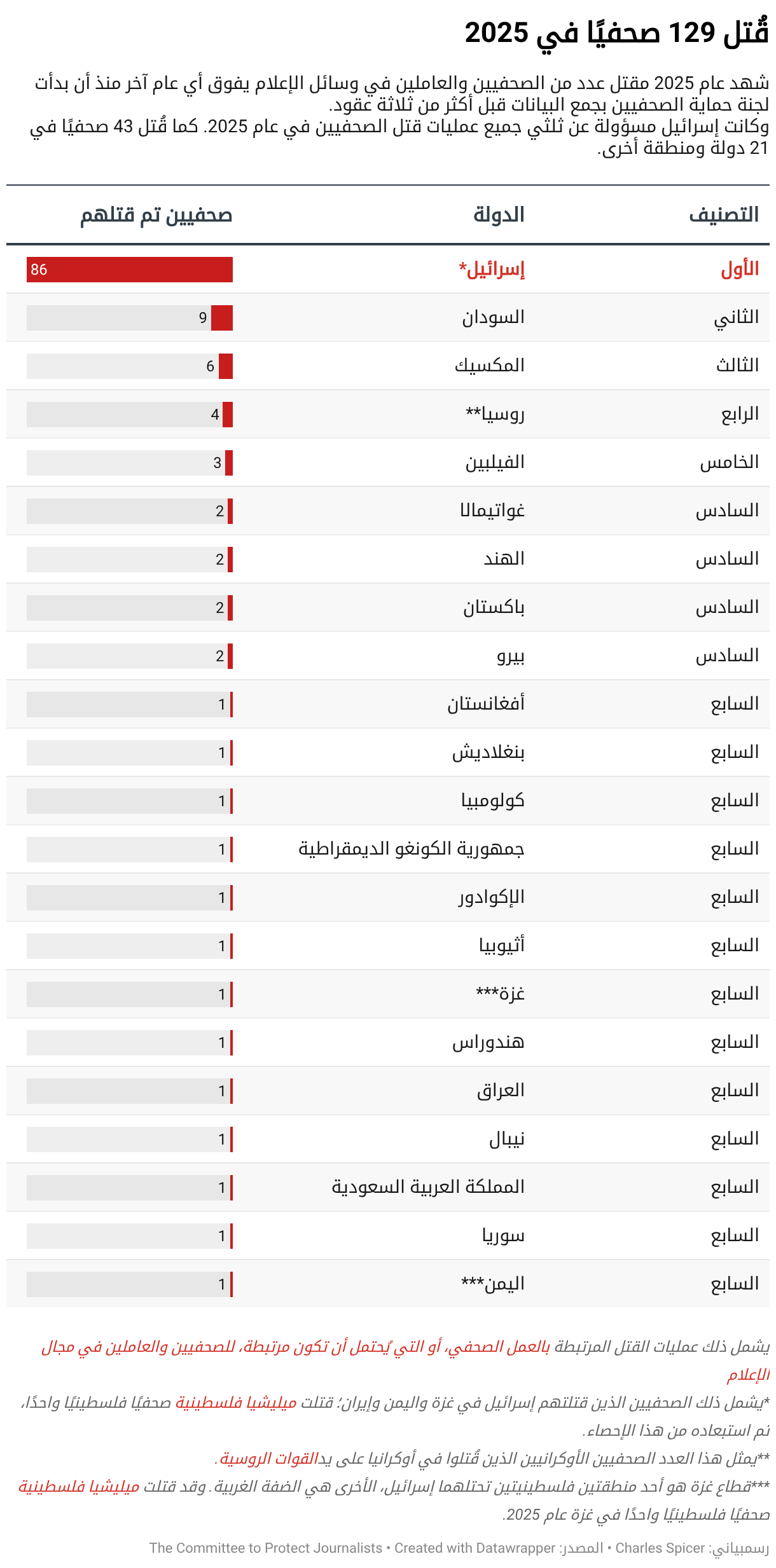 وكانت إسرائيل مسؤولة عن ثلثي جميع عمليات قتل الصحفيين في عام 2025. كما قُتل 43 صحفيًا في 21 دولة ومنطقة أخرى.