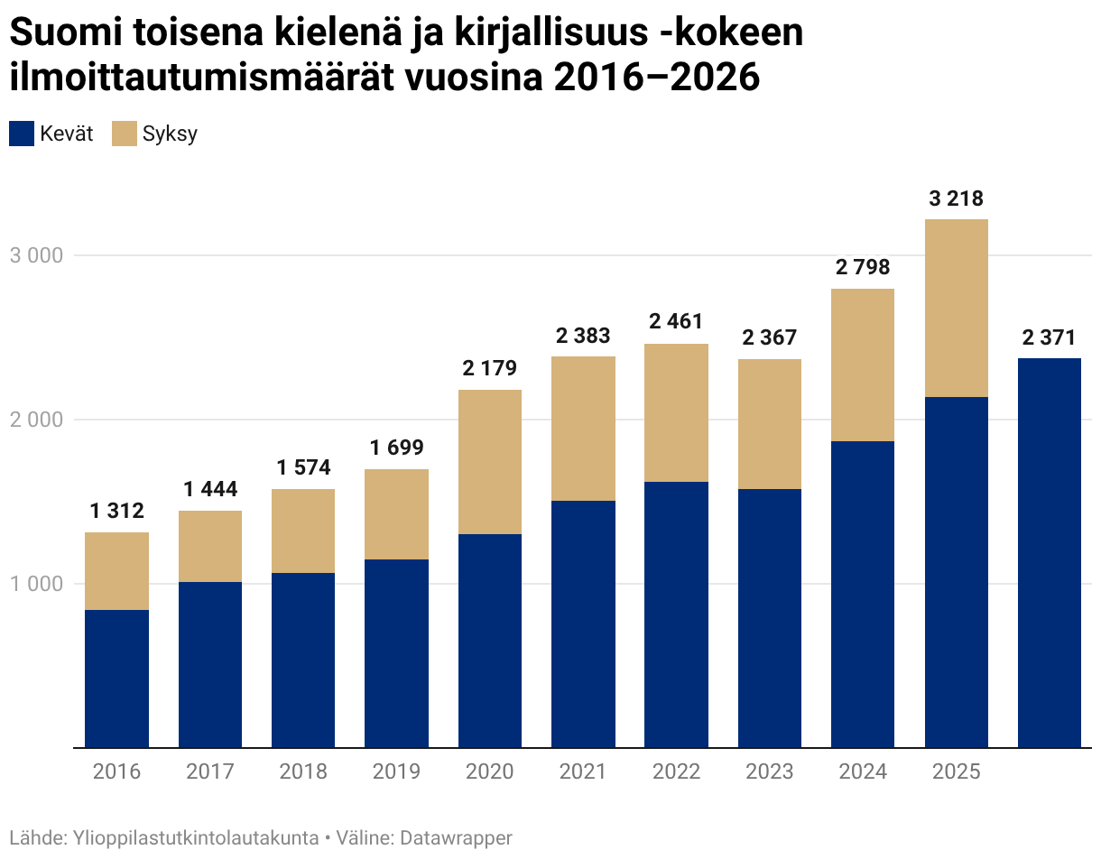 Suomi toisena kielenä ja kirjallisuus -kokeen ilmoittautumismäärät vuosina 2016–2026