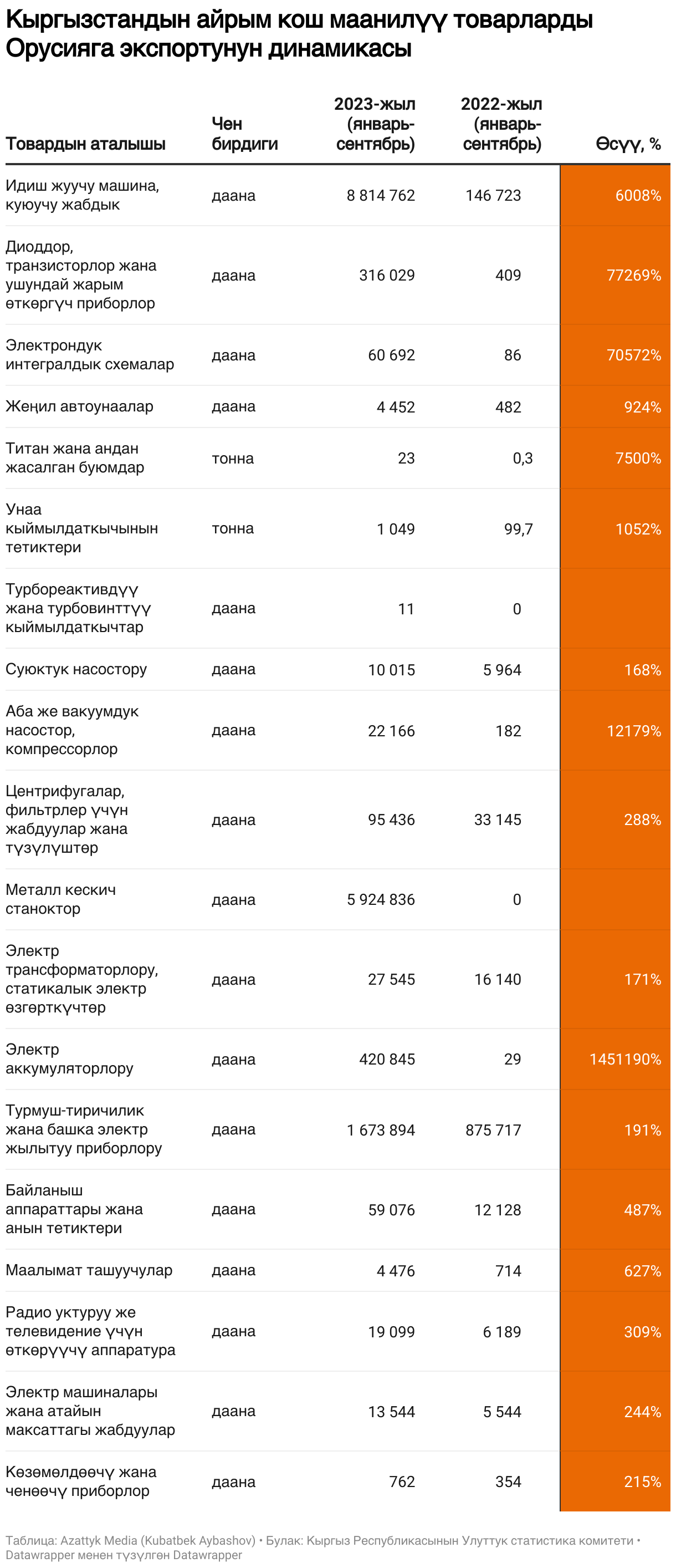 Кыргызстандын айрым кош маанилүү товарларды Орусияга экспортунун динамикасы