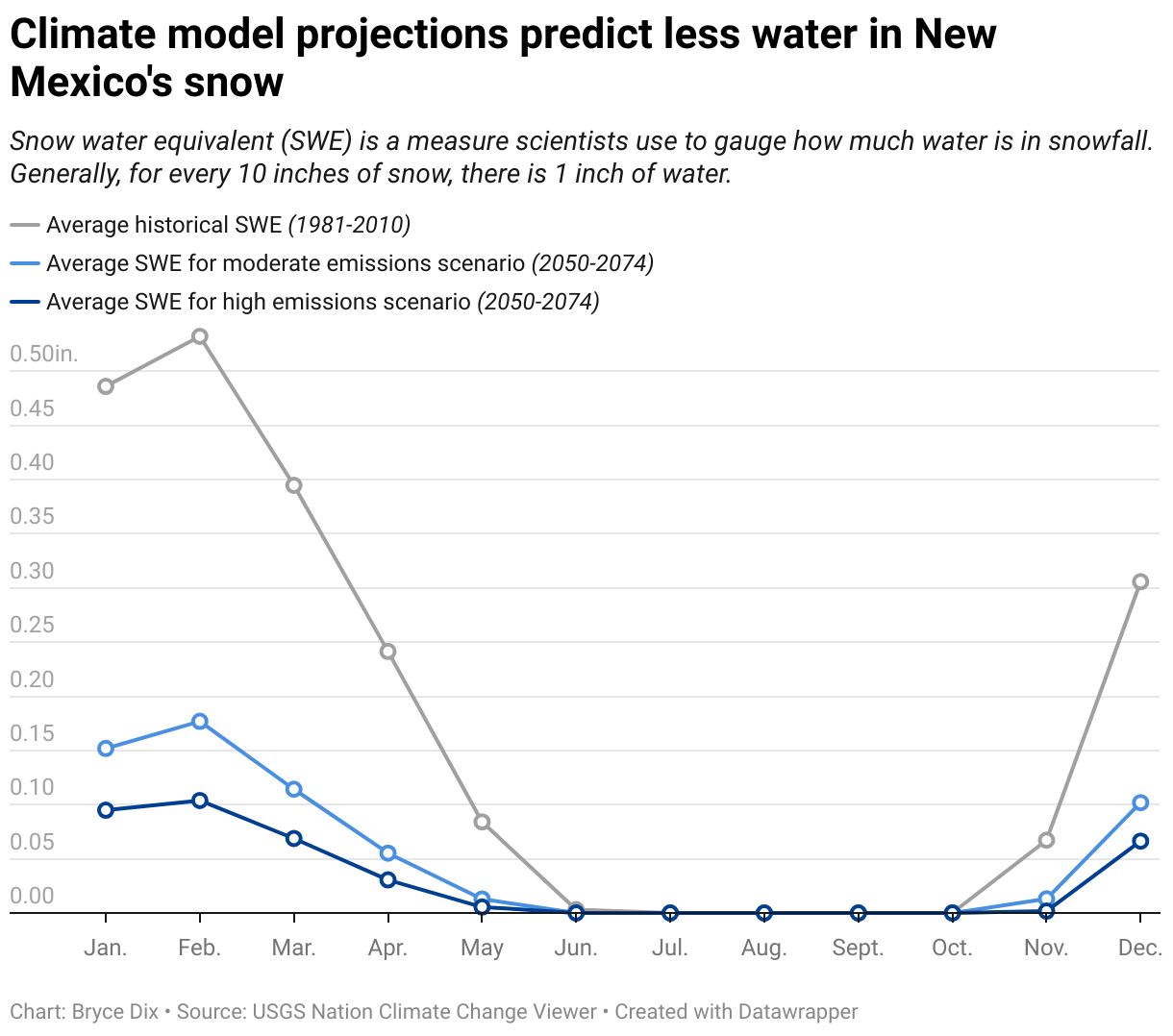 Snow water equivalent (SWE) is a measure scientists use to gauge how much water is in snowfall. Generally, for every 10 inches of snow, there is 1 inch of water.