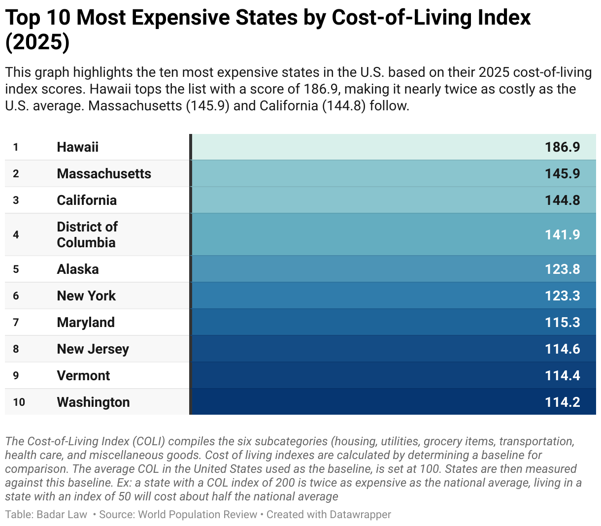 This graph highlights the ten most expensive states in the U.S. based on their 2025 cost-of-living index scores. Hawaii tops the list with a score of 186.9, making it nearly twice as costly as the U.S. average. Massachusetts (145.9) and California (144.8) follow.