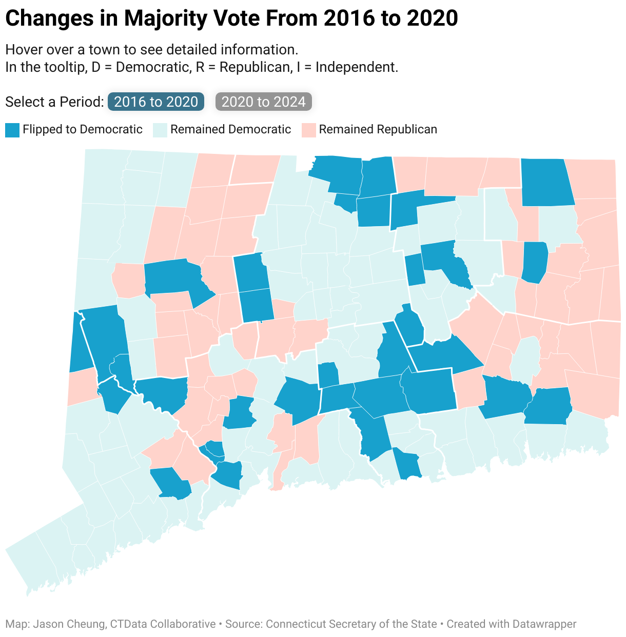 Hover over a town to see detailed information. In the tooltip, D = Democratic, R = Republican, I = Independent. Select a Period: 2016 to 2020 2020 to 2024