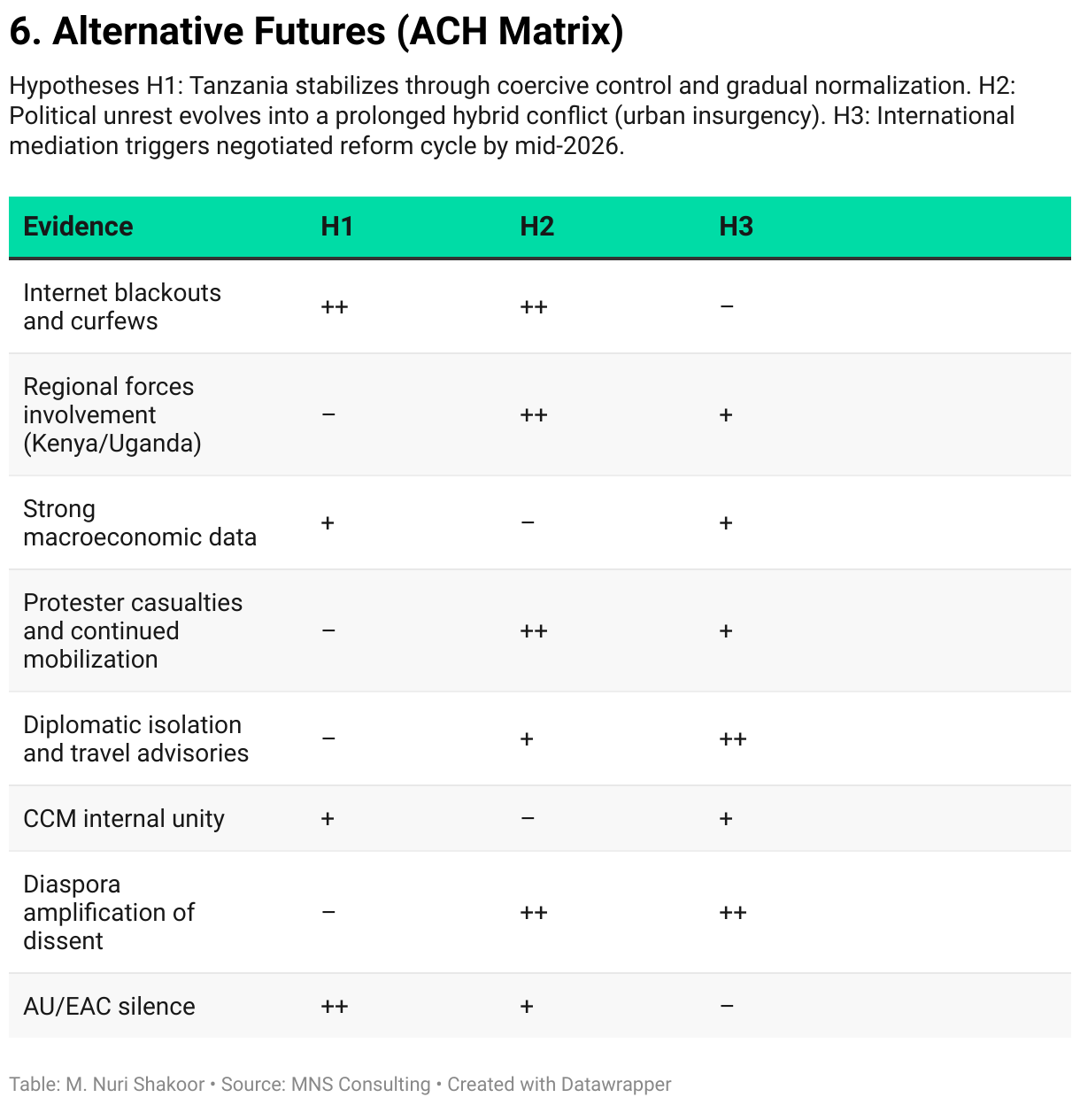 Hypotheses H1: Tanzania stabilizes through coercive control and gradual normalization. H2: Political unrest evolves into a prolonged hybrid conflict (urban insurgency). H3: International mediation triggers negotiated reform cycle by mid-2026.