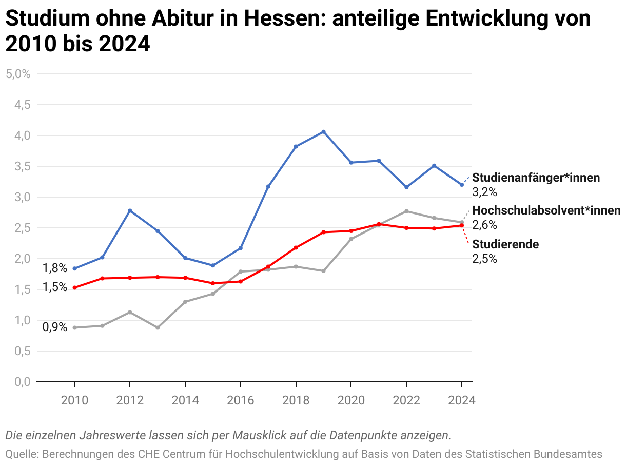 Studium ohne Abitur in Hessen: anteilige Entwicklung von 2010 bis 2024