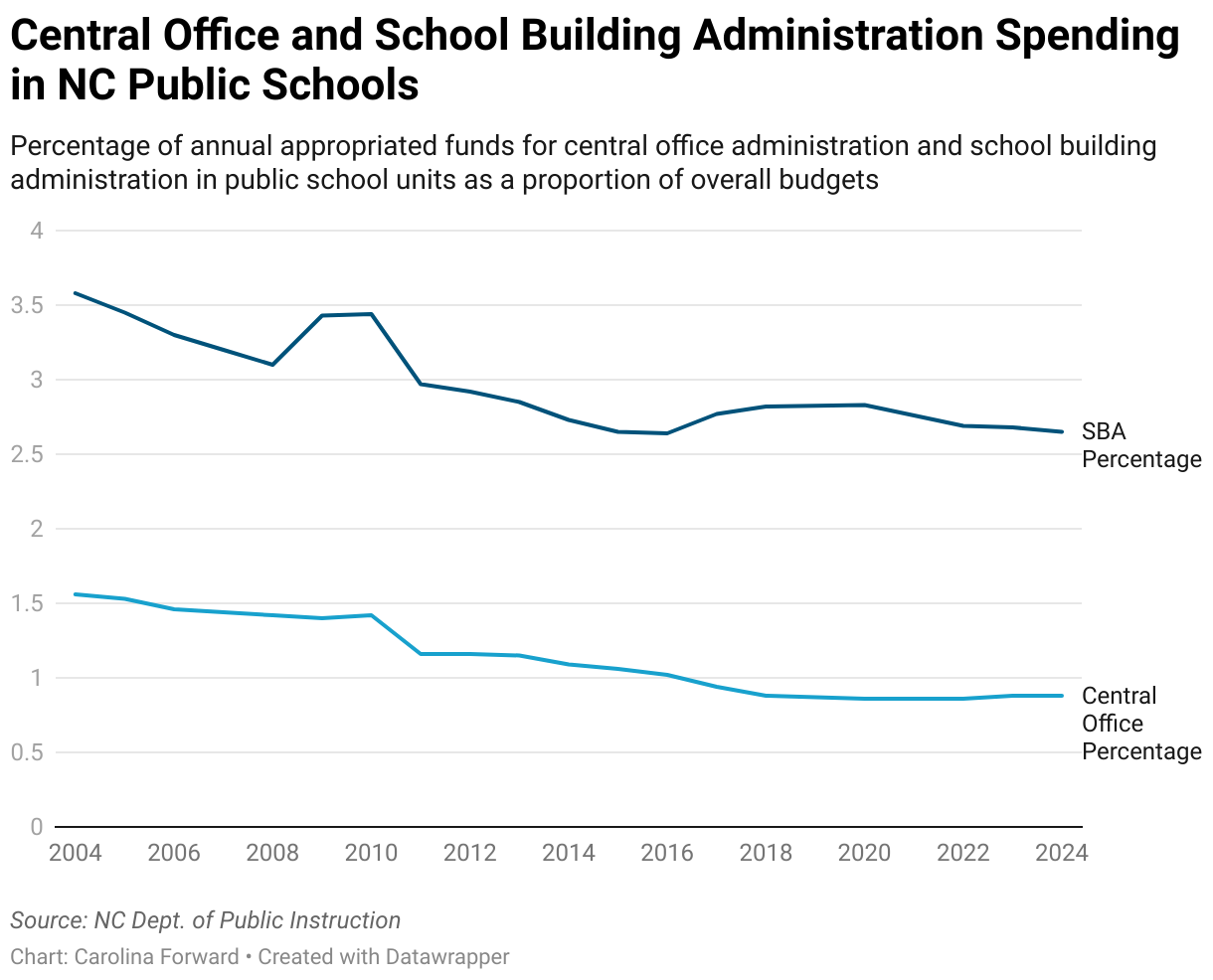 Percentage of annual appropriated funds for central office administration and school building administration in public school units as a proportion of overall budgets